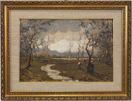 Giovanni Guarlotti Galliate (NO) 1869 - 1954 Torino, Pascolo, Olio su tavola cm 35x51 firmato in basso a dx datato 1930