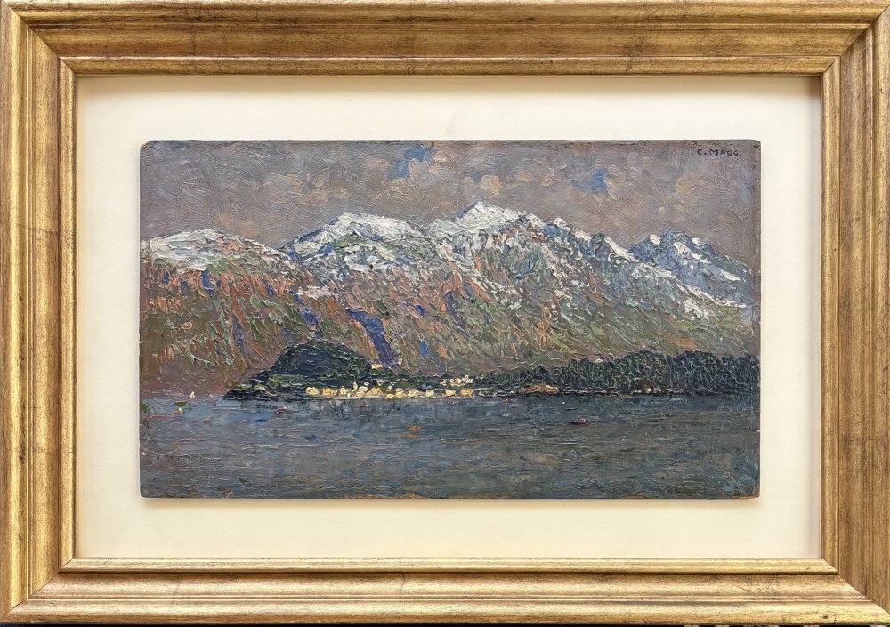 Cesare Maggi Roma 1881 - 1961 Torino, Monti sopra Bellagio, lago di Como, olio su tavoletta cm 23x40 firmato in alto a dx