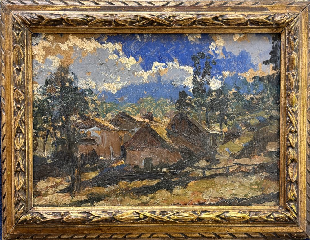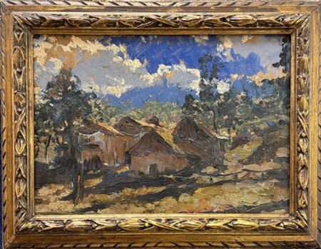 Anonimo del XIX secolo, Italia del XIX secolo, Paesaggio con casolari, olio su cartone cm 23,5x34