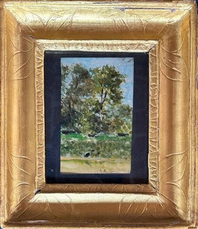 Roberto Fontana, Milano 1844 - 1907, Paesaggio con albero, Olio su carta 11,2x7,3m firmato in basso al centro