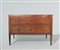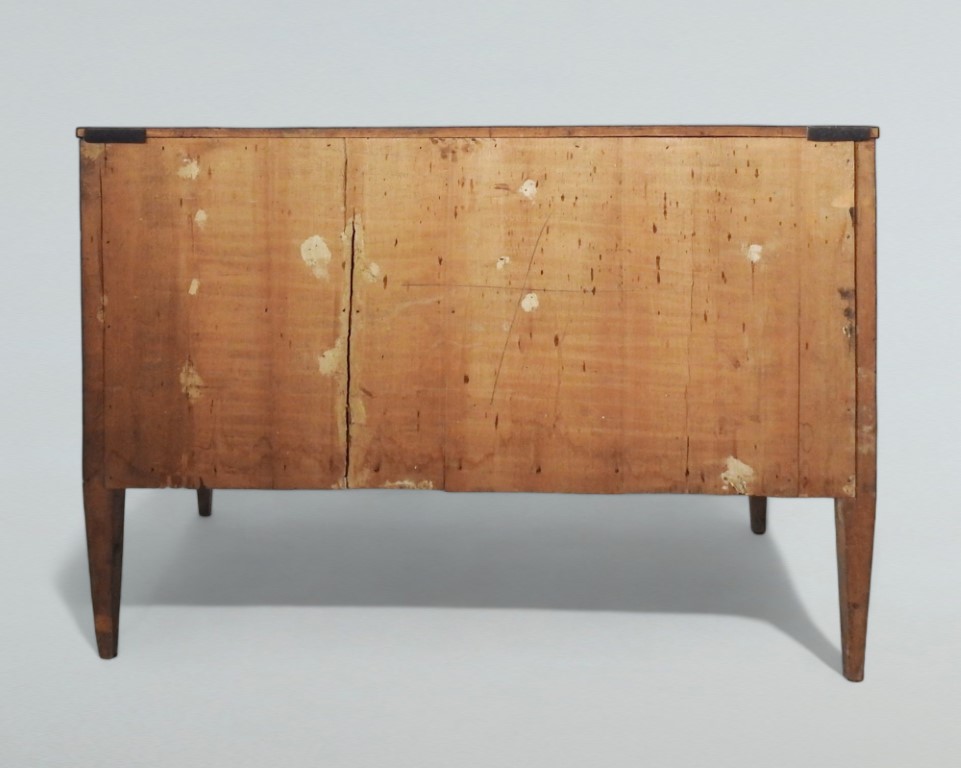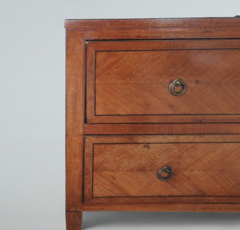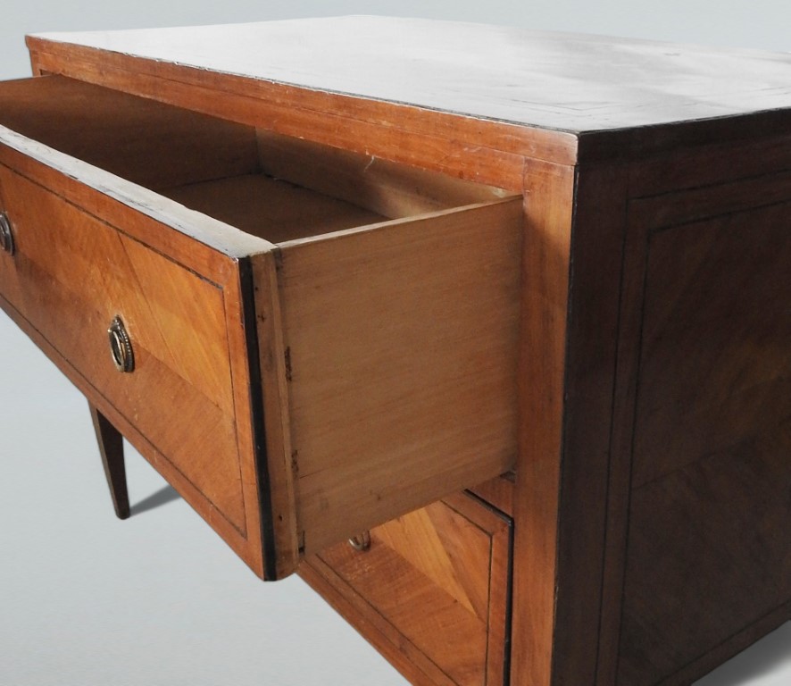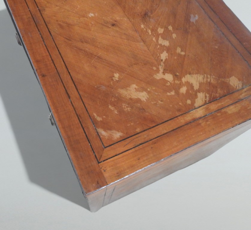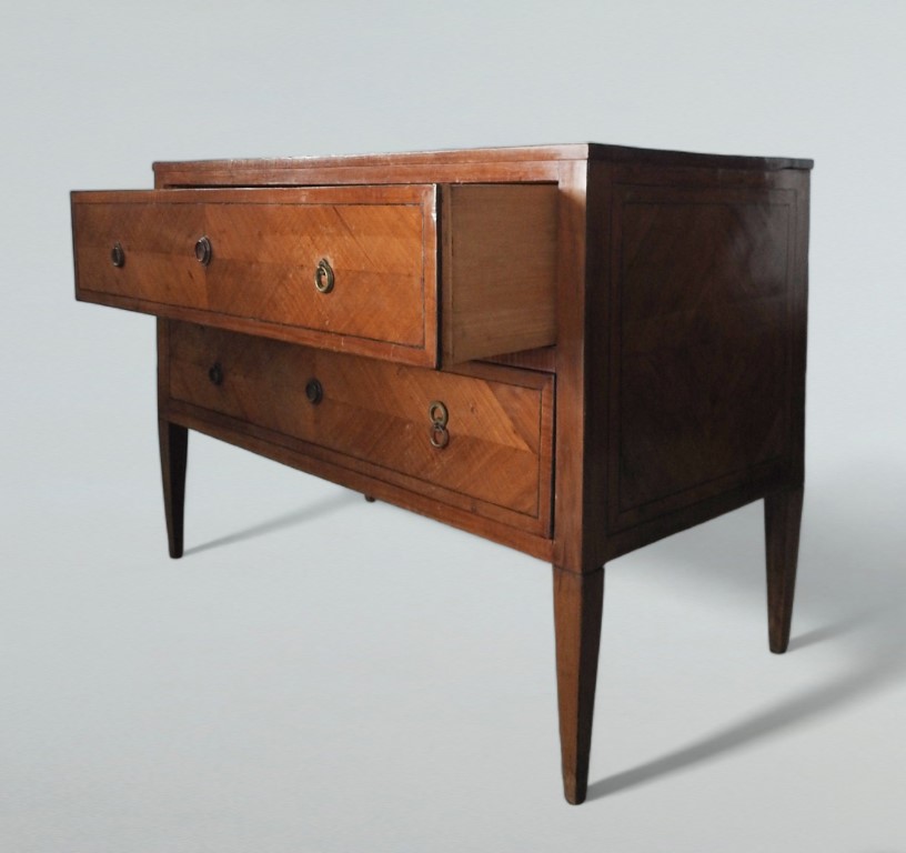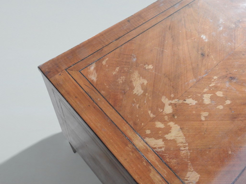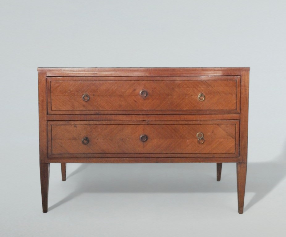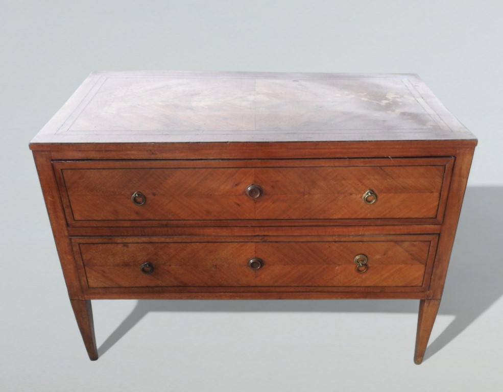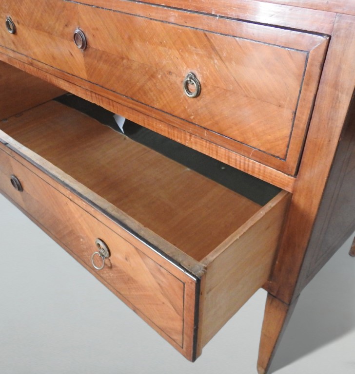 piano rettangolare, due cassetti, gambe troncopiramidali