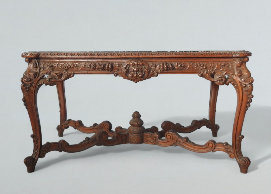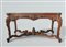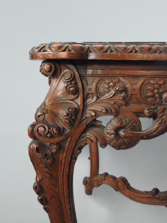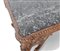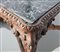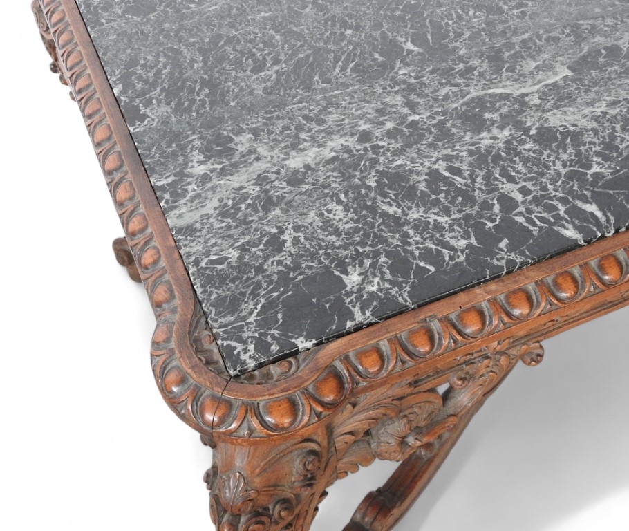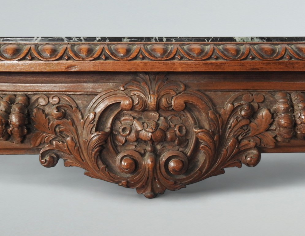 piano rettangolare in marmo verde del Guatemala, fascia riccamente intagliata a motivi vegetali, gambe sinuose decorate da conchiglia e con piedi a ricciolo, riunite da crociera sagomata sormontata da pinnacolo