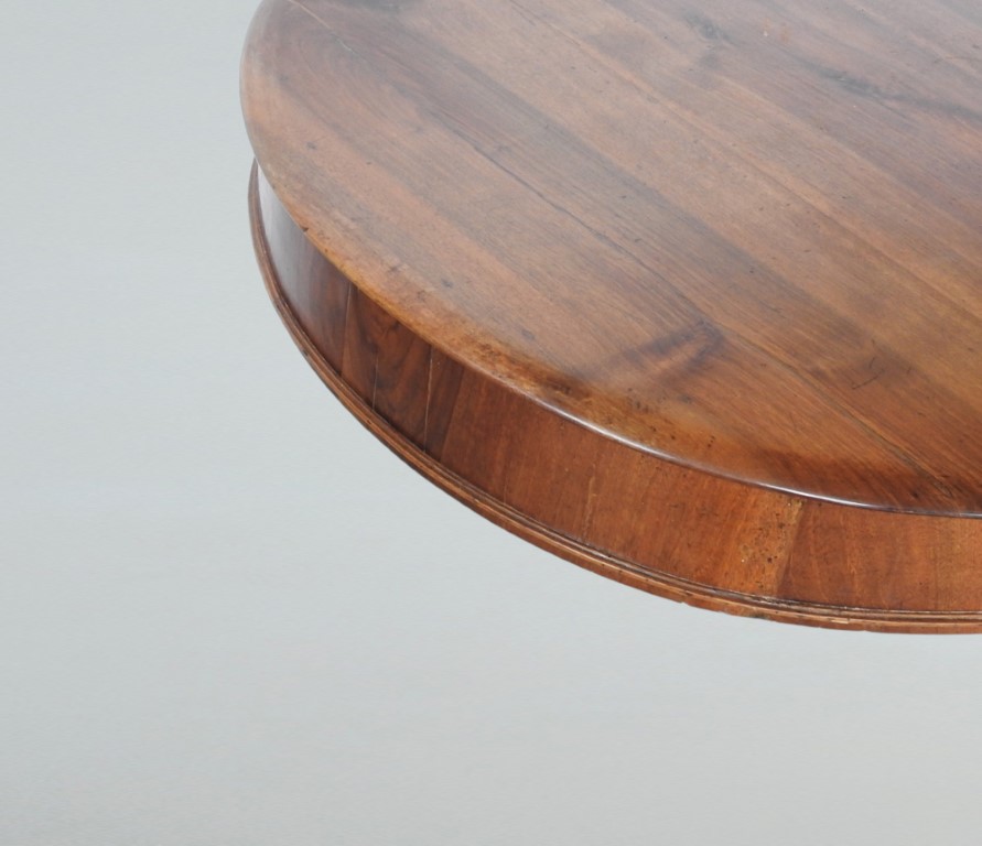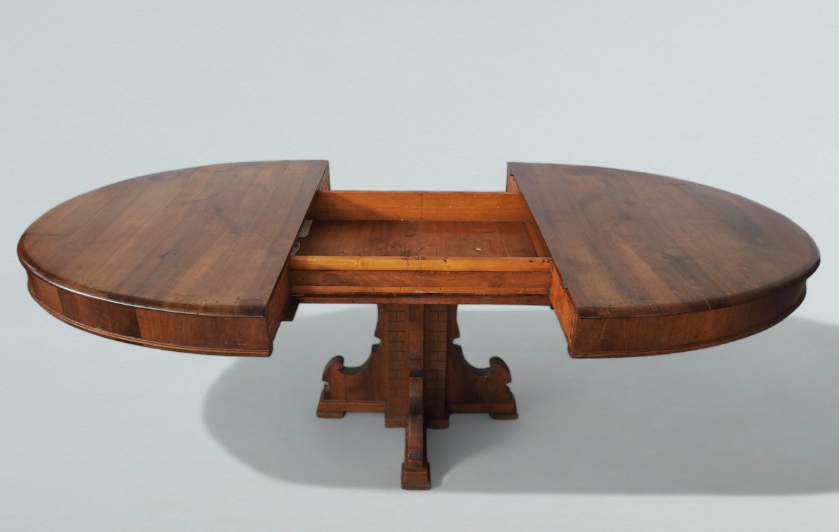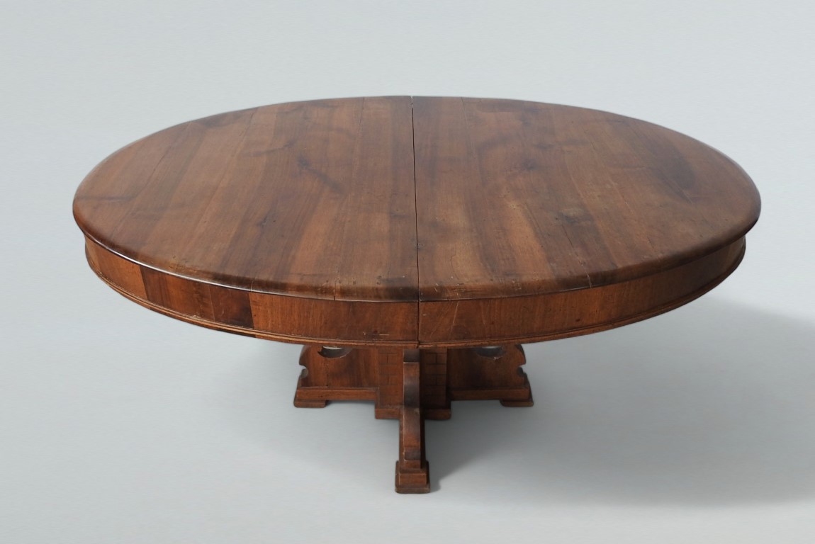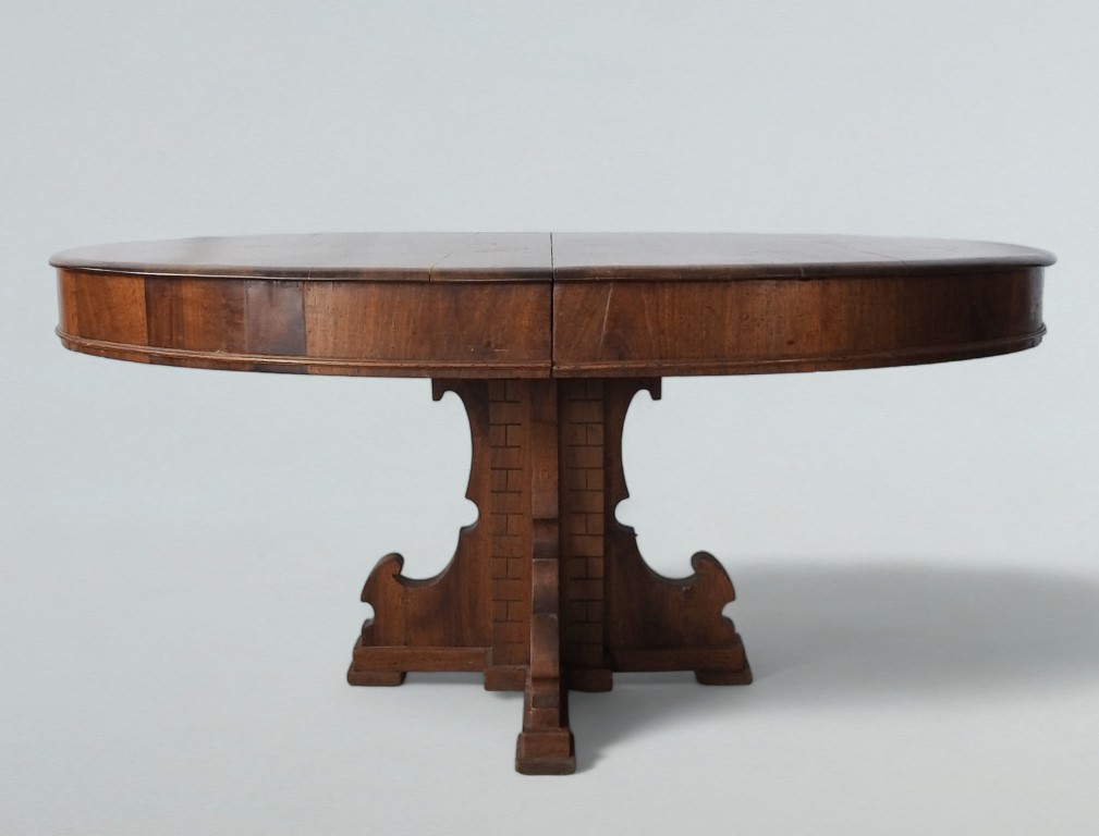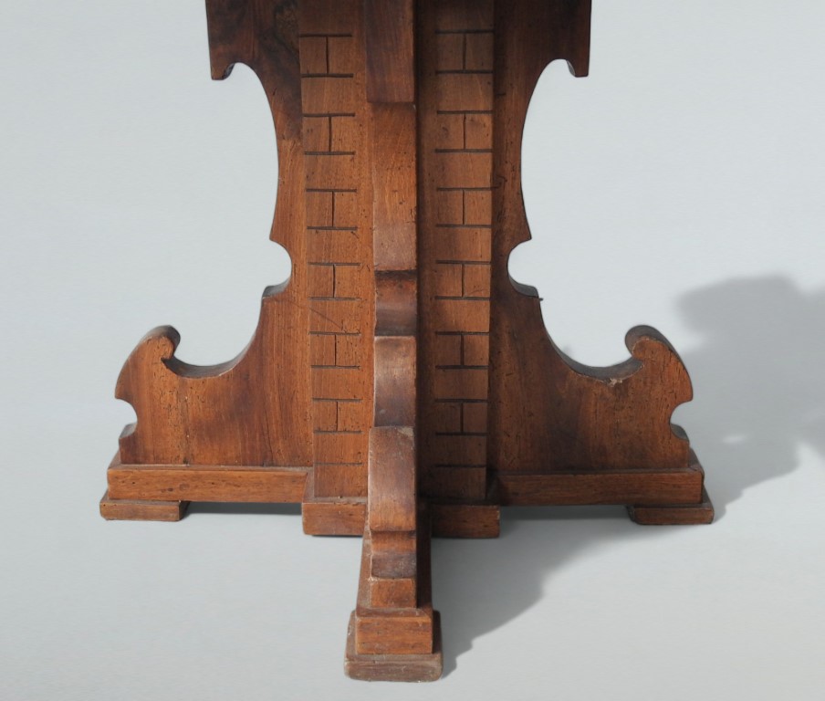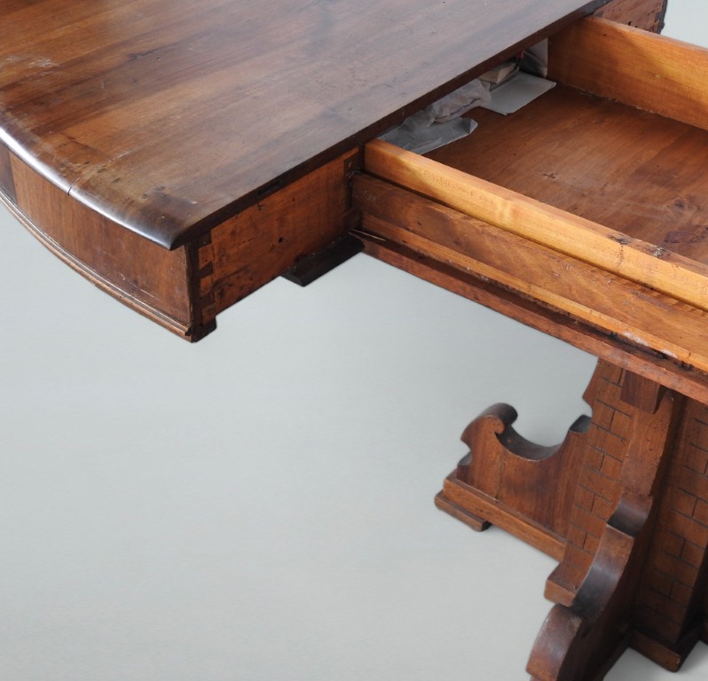 piano ovale, basamento a plinto a finti mattoni, su zampe a voluta