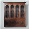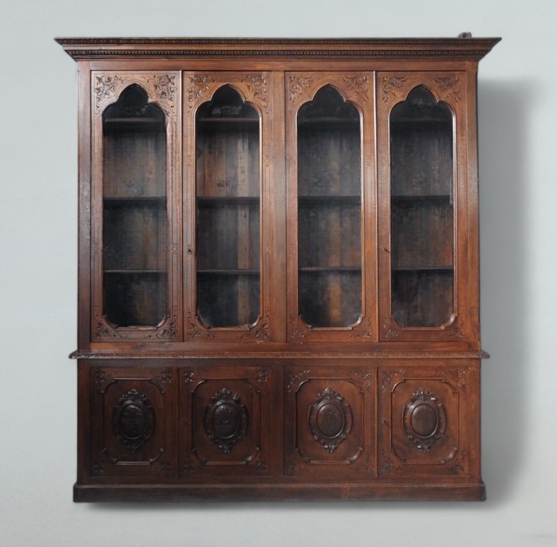 intagliata a motivi vegetali, quattro sportelli a vetri nella parte superiore e quattro in quella inferiore, decorati da formelle bombate applicate, base modanata