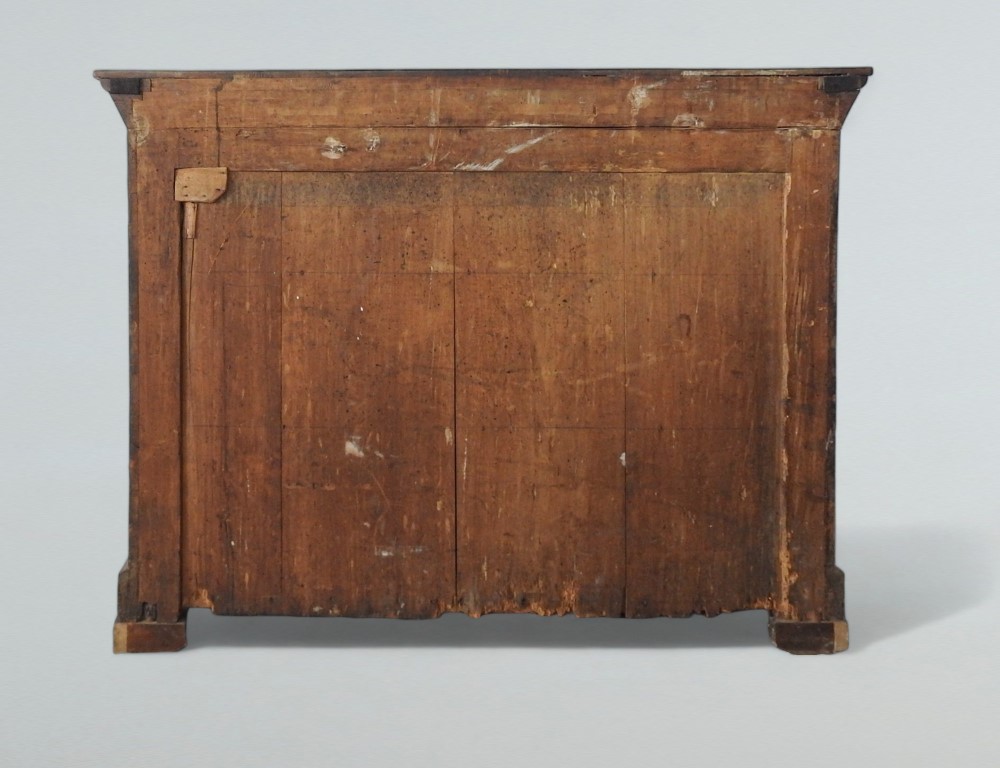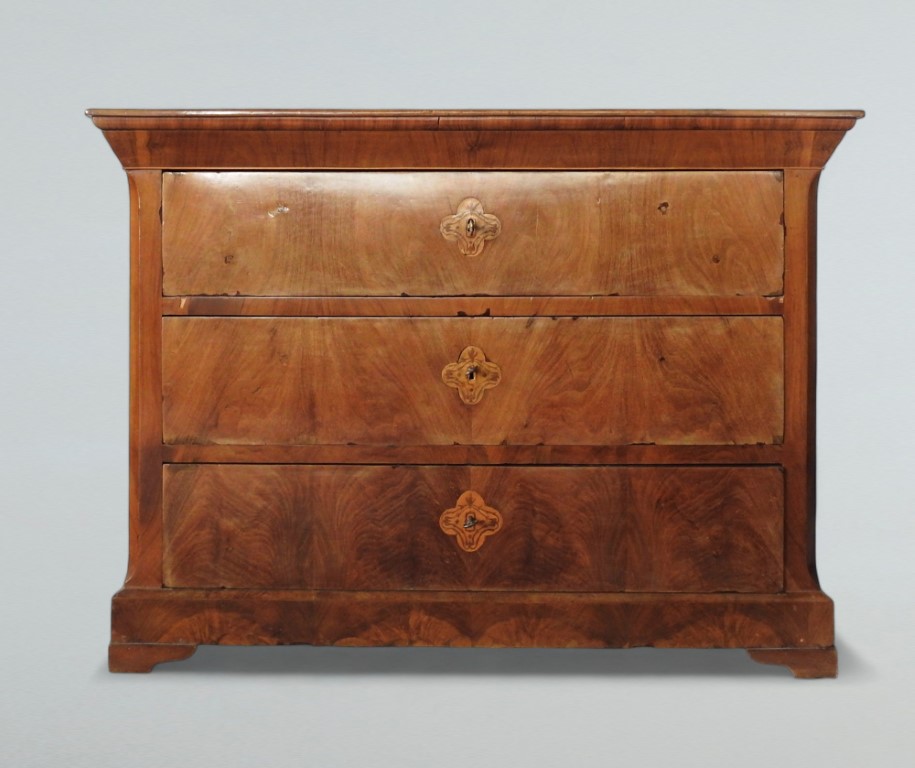 piano rettangolare, tre cassetti con bocchette intarsiate a quadrifoglio, base modanata