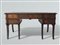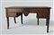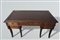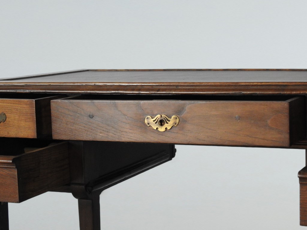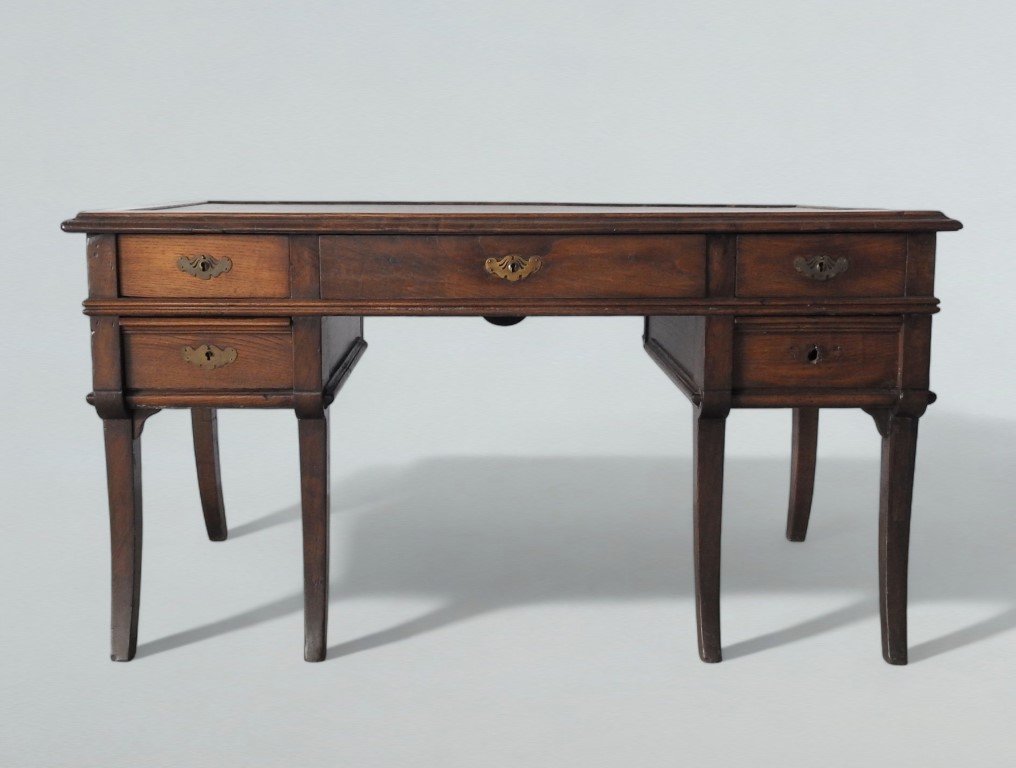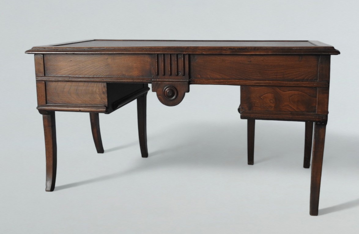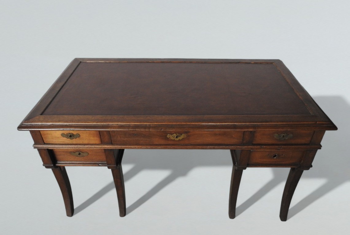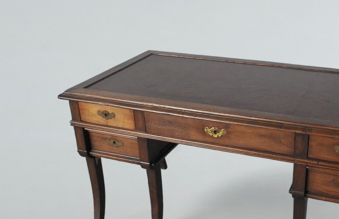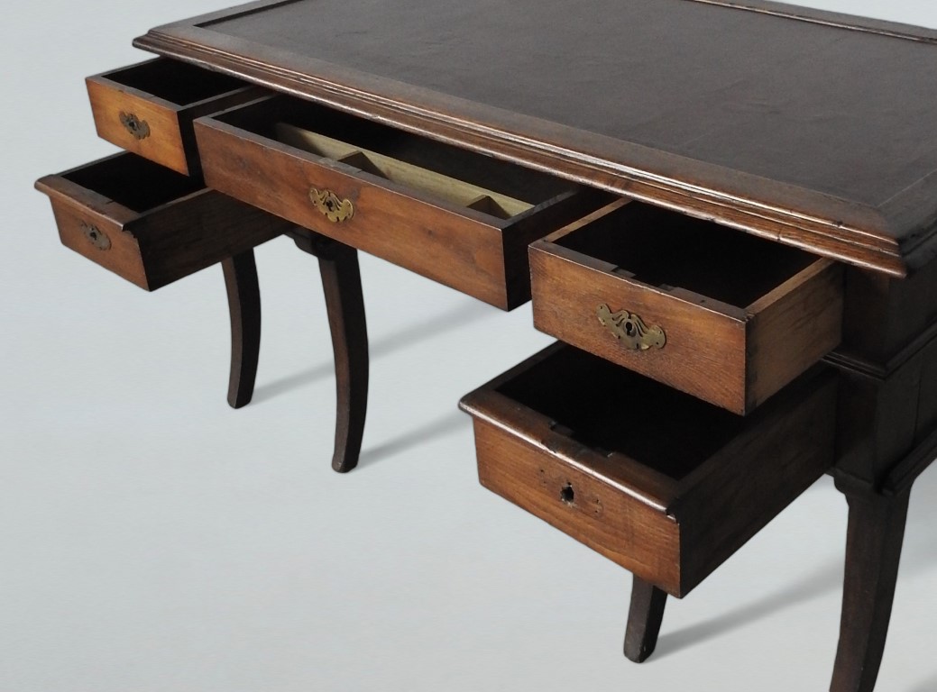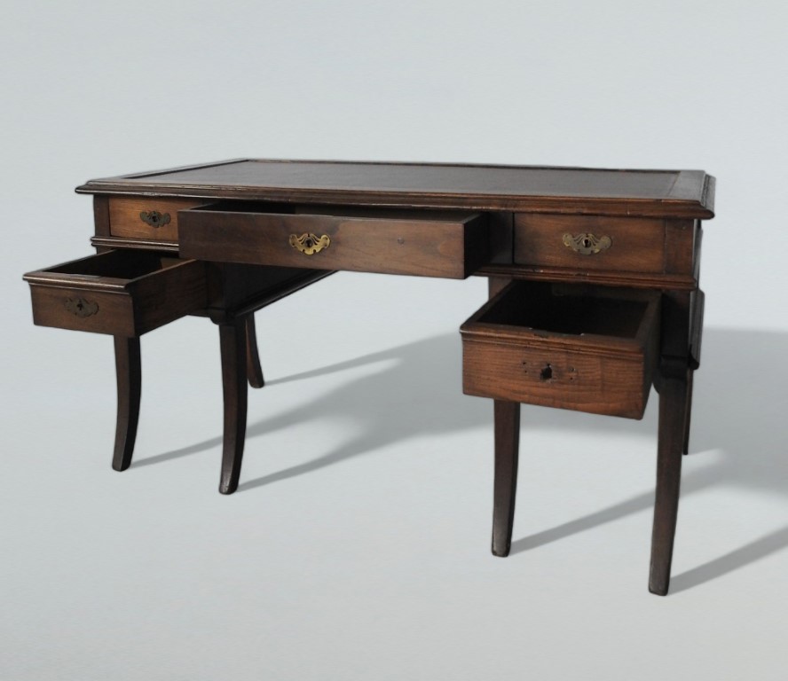piano rettangolare con vetro, cinque cassetti, gambe a sciabola
