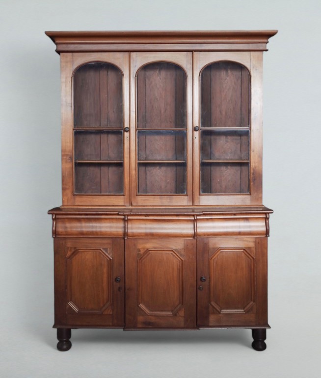 alzata a tre sportelli a vetri, base con tre cassetti e tre sportelli, sformellati, gambe tornite