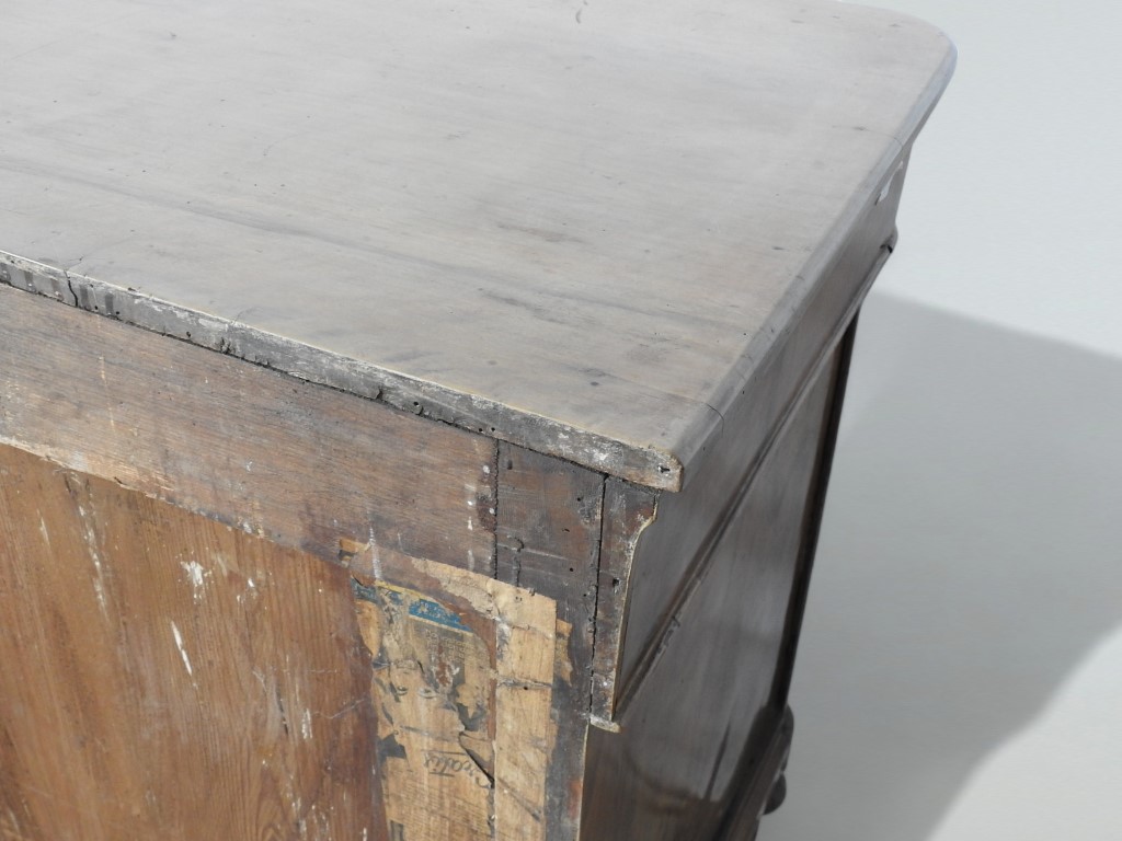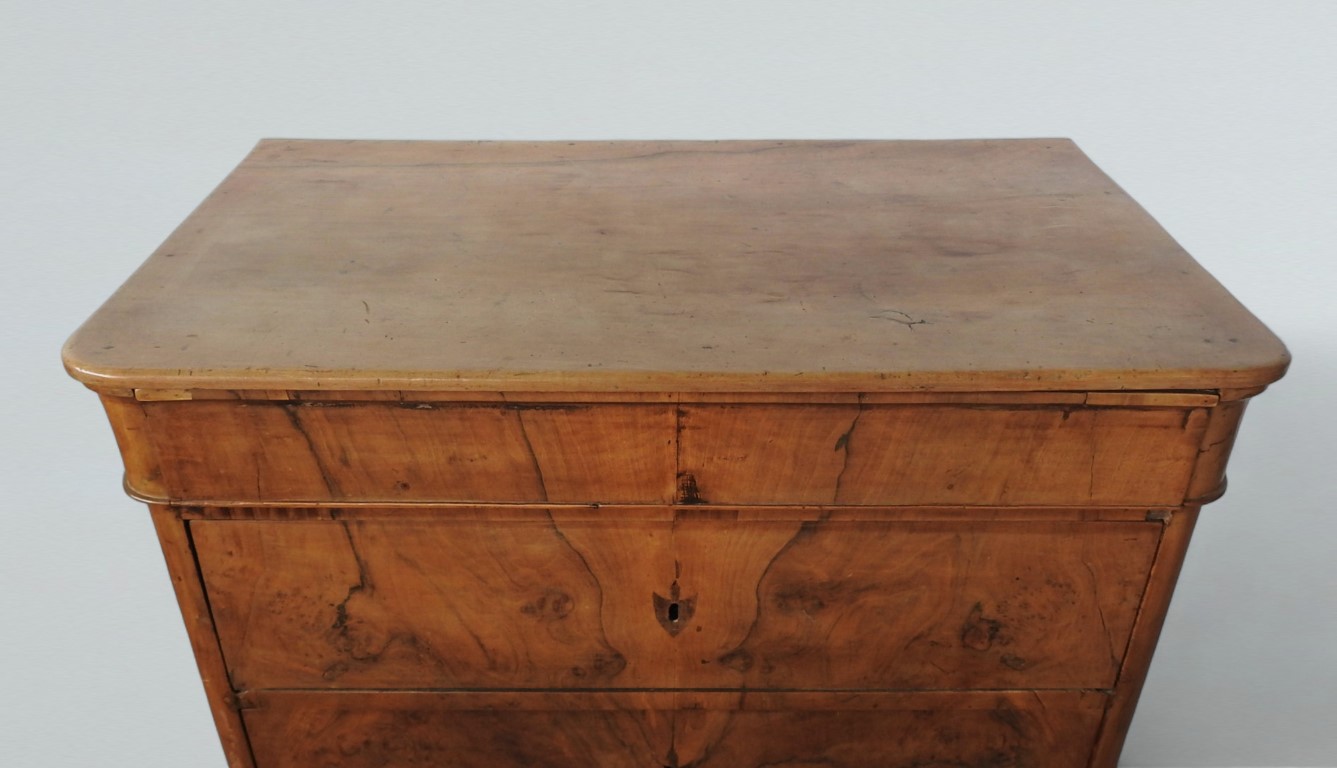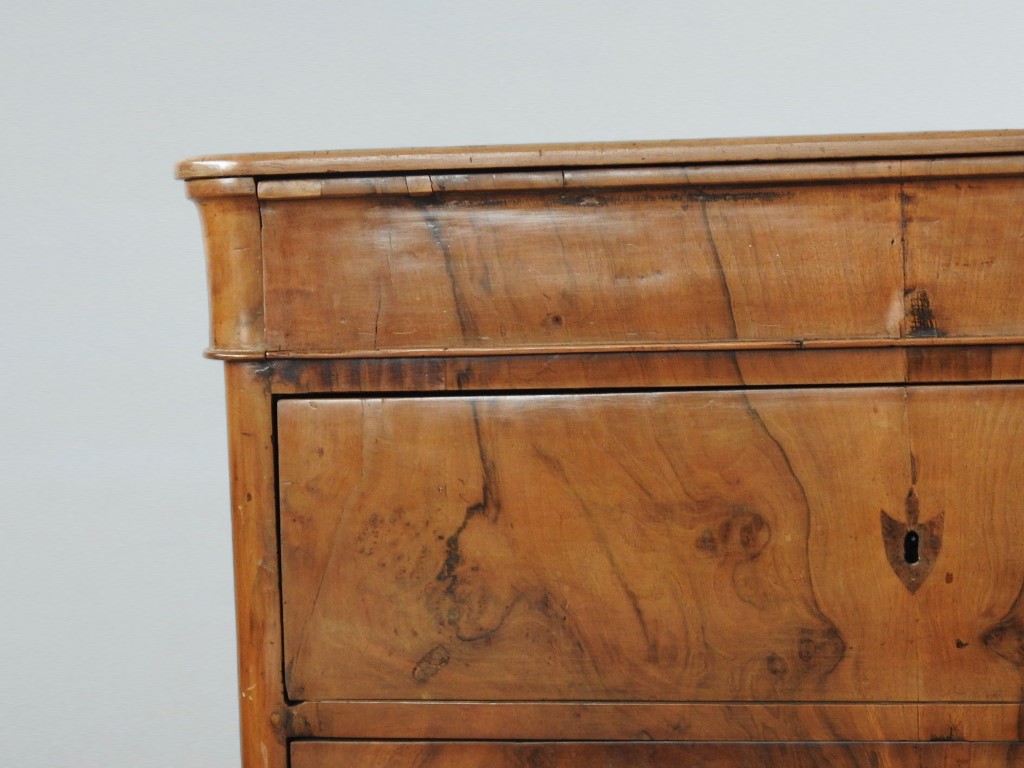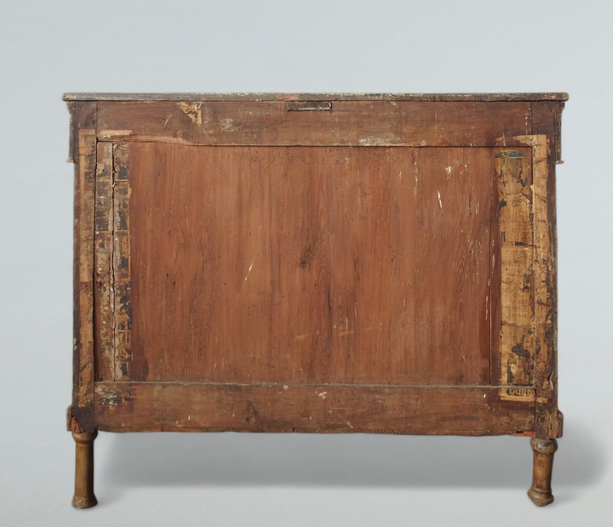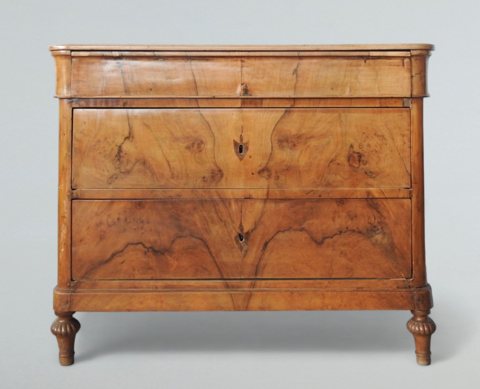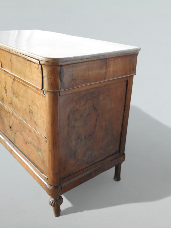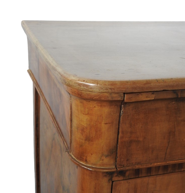 piano rettangolare, un cassetto nella fascia e due cassetti sottostanti con bocchette intarsiate a scudo, base modanata, piedi torniti e scannellati