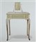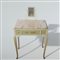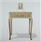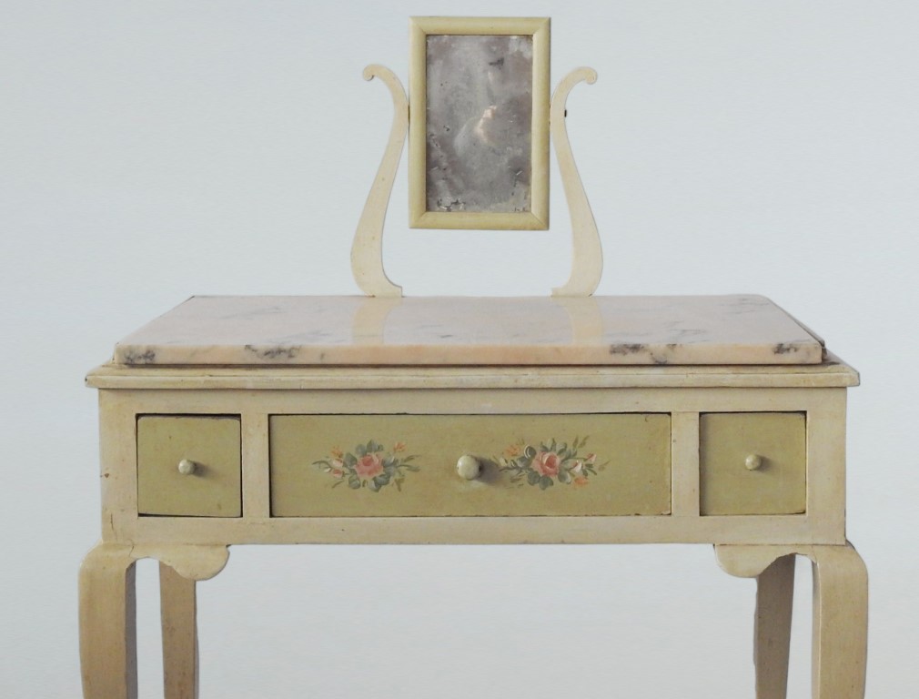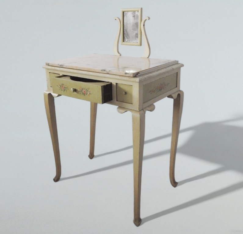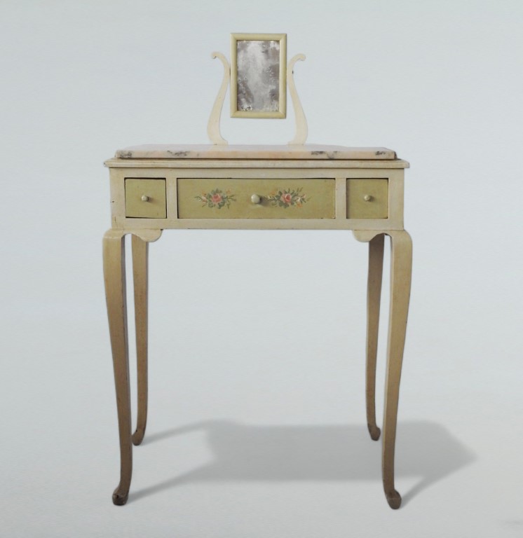 piano in marmo rosa, piccolo specchio a bilico, tre cassetti, gambe sinuose