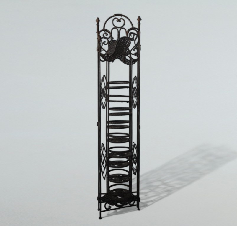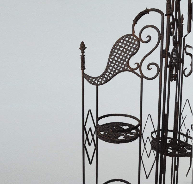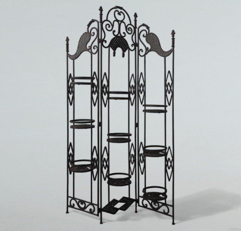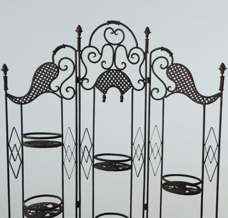 Grande portavasi a paravento in ferro battuto e traforato e ghisa