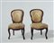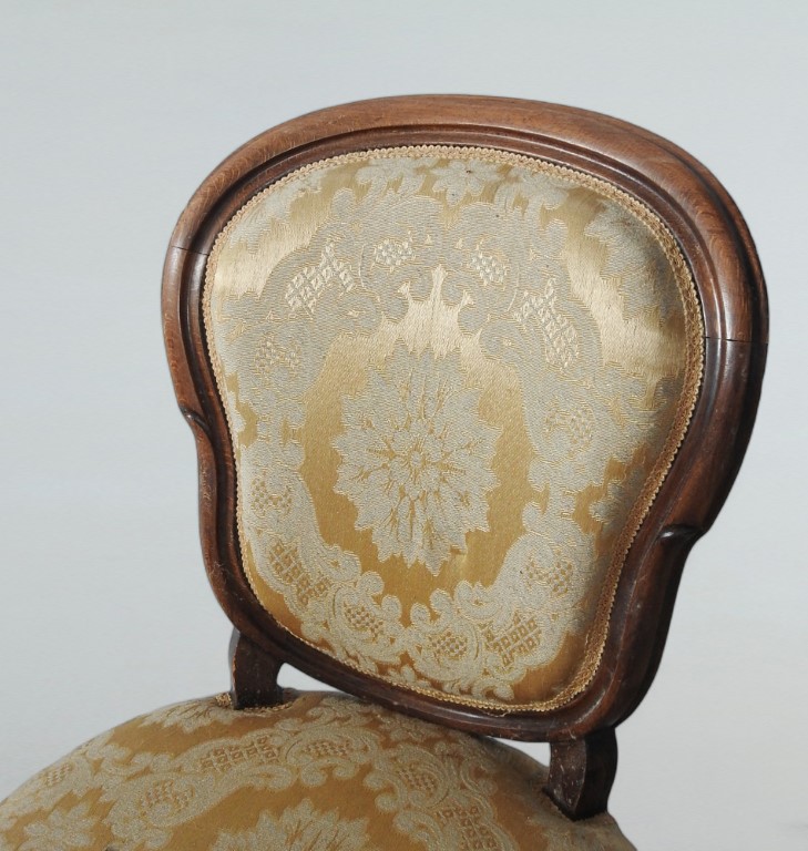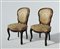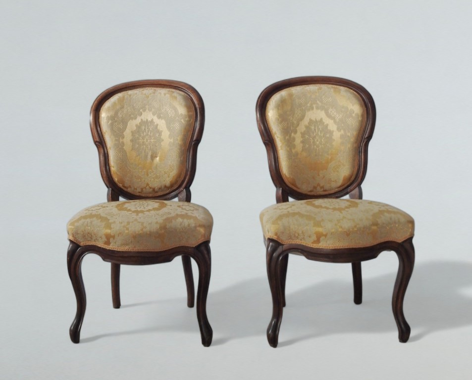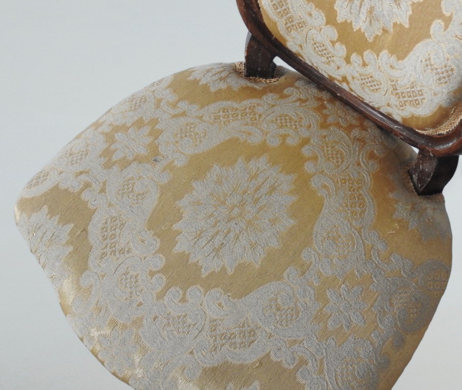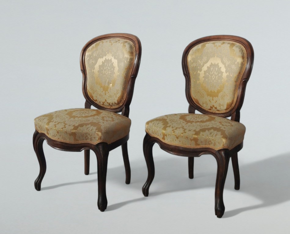 schienali sagomati, gambe mosse su piedi a ricciolo, ricoperte in tessuto a fiori