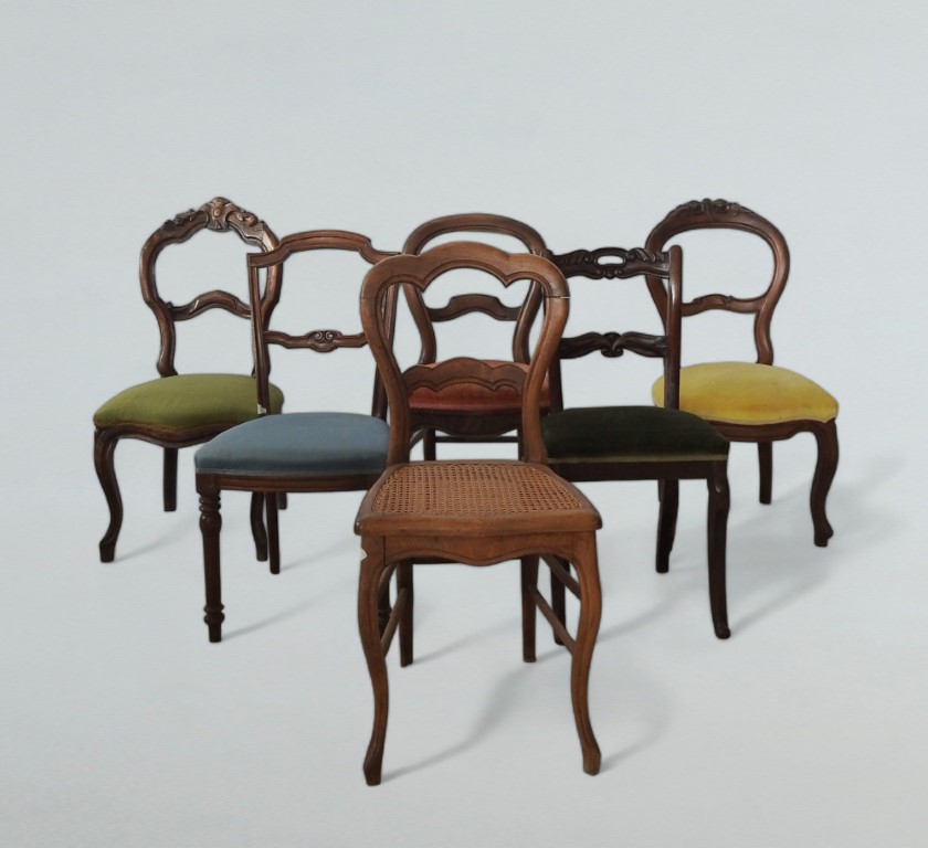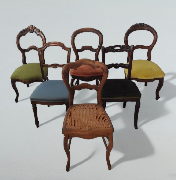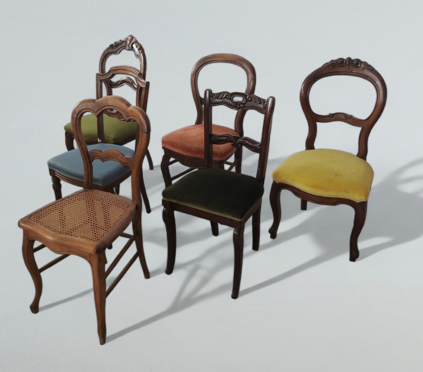 diverse fra loro, schienali sagomati, gambe mosse su piedi a ricciolo, ricoperte in tessuto colorato e cannetté