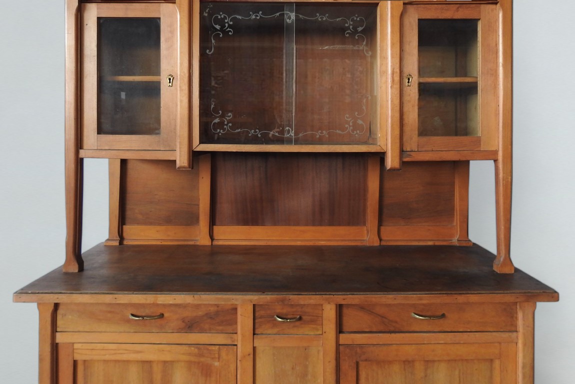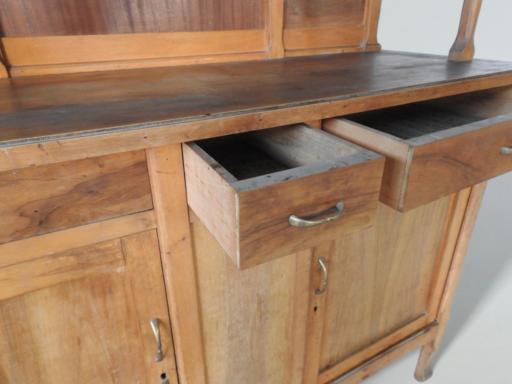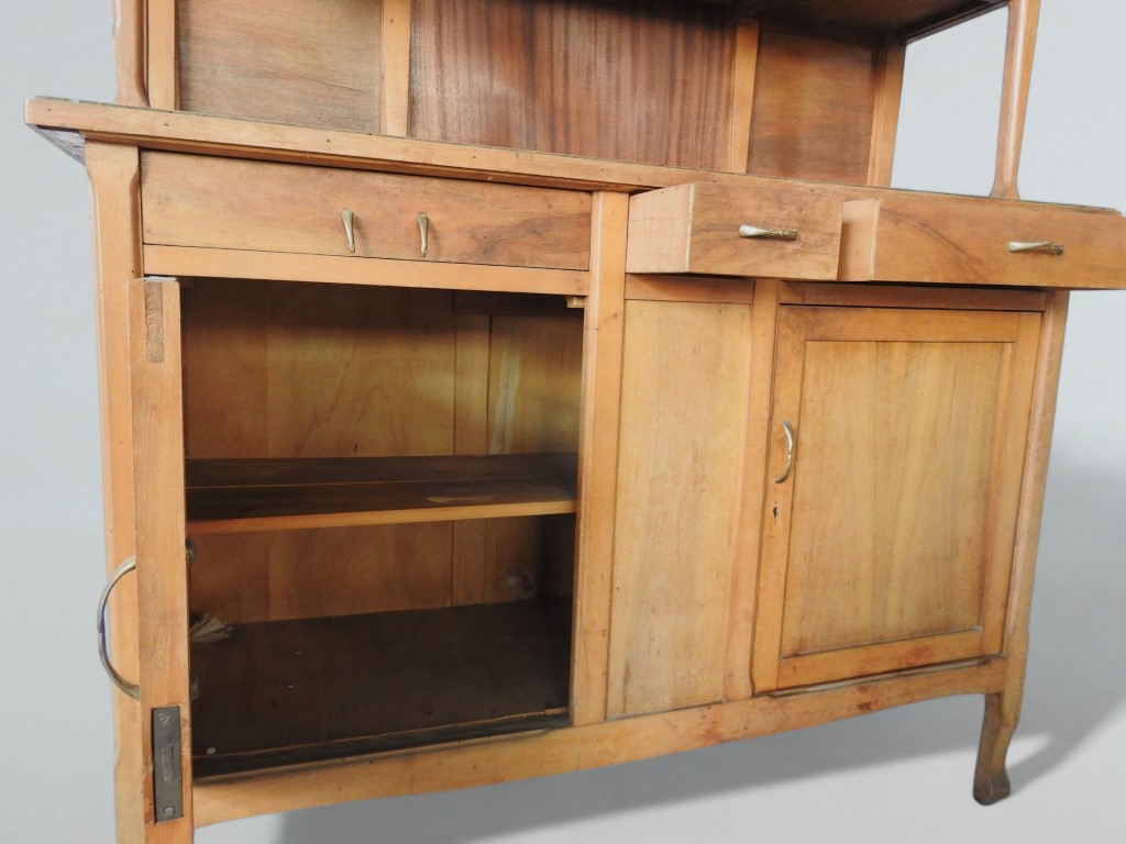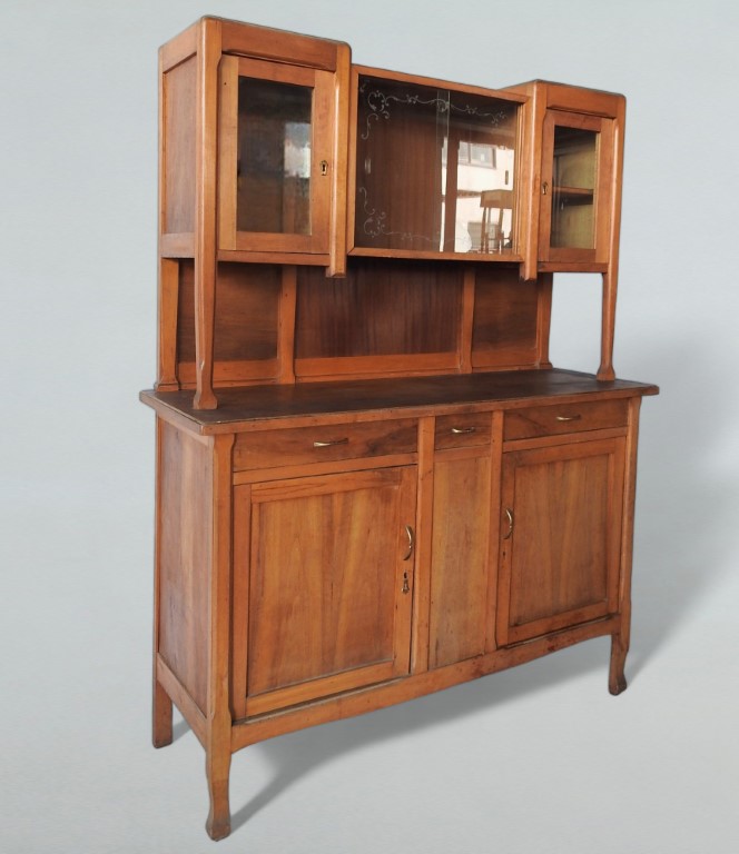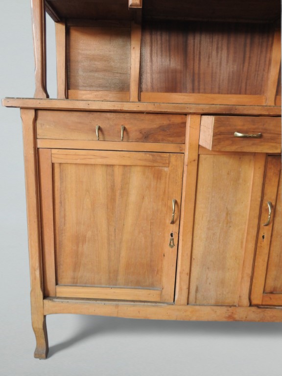 parte superiore con due sportelli a vetri e vano a giorno, inferiore a tre cassetti e due sportelli