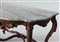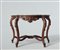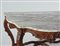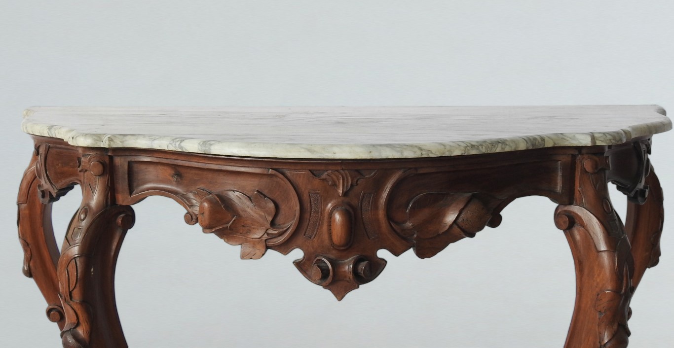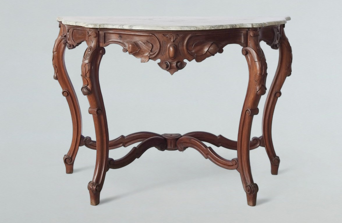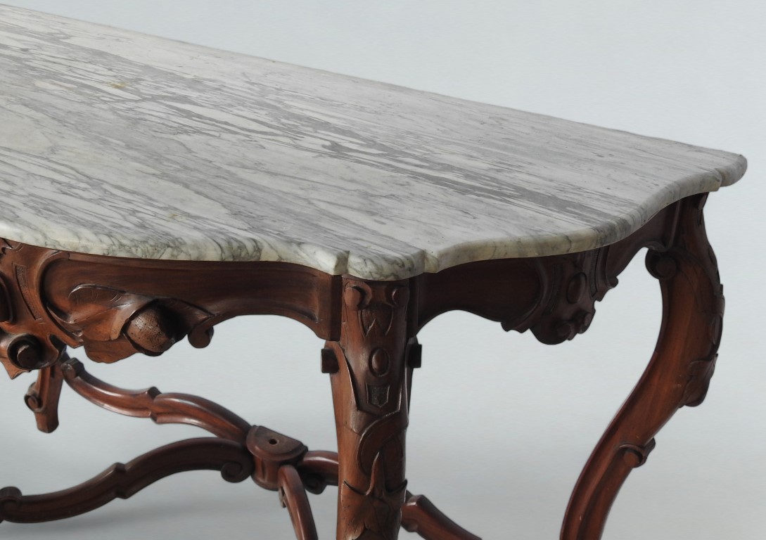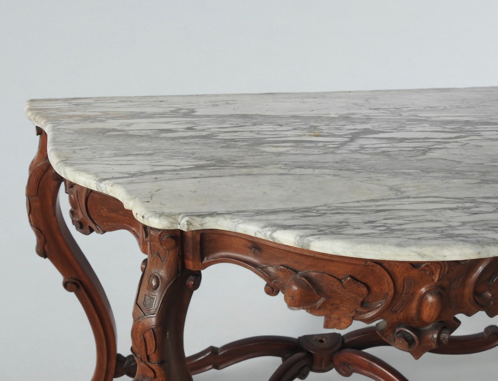 piano sagomato in marmo venato, fascia mossa con elementi fitomorfi, gambe sinuose riunite da crociera