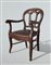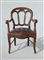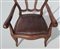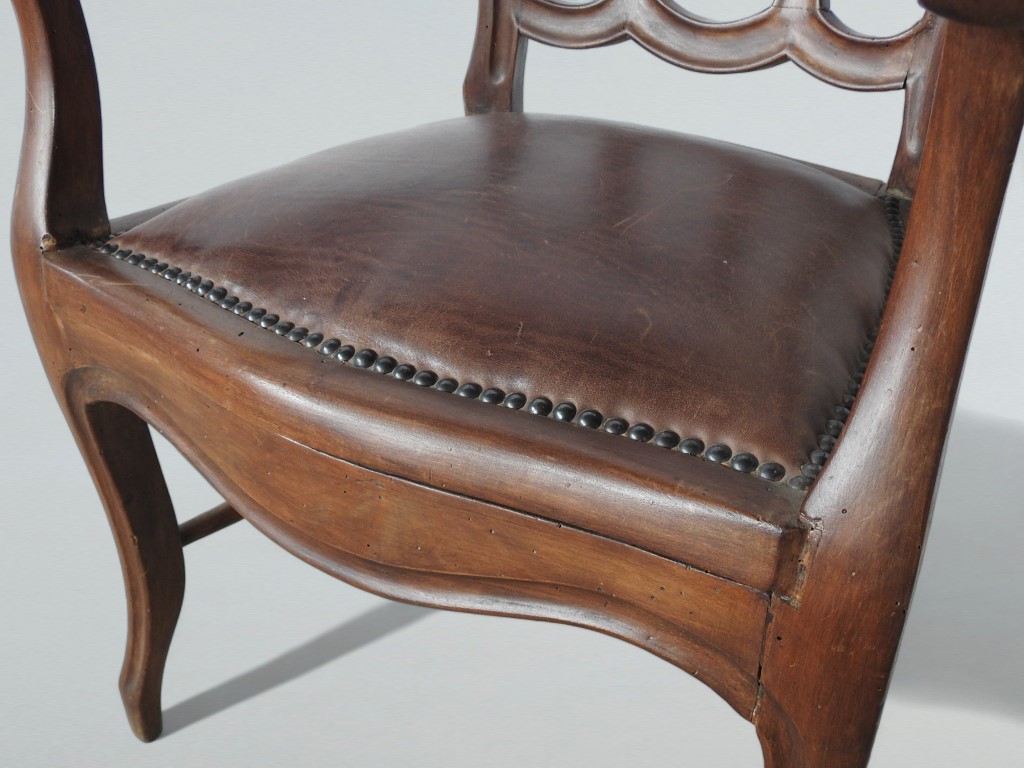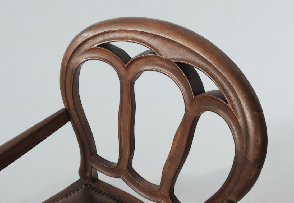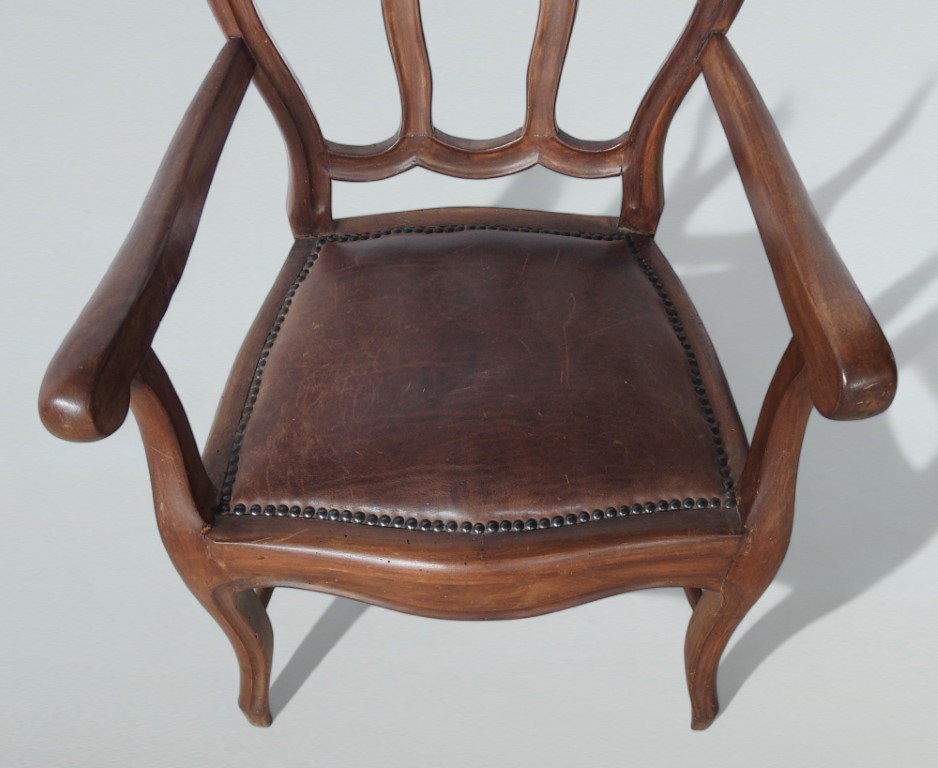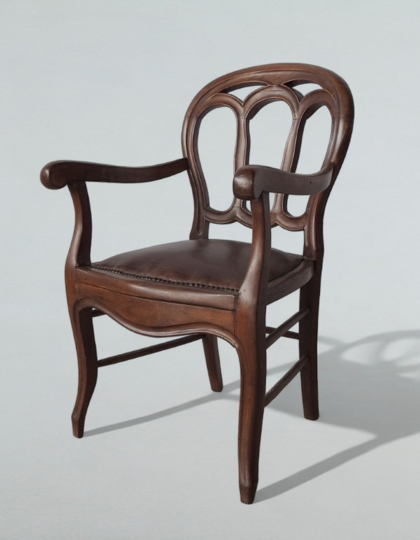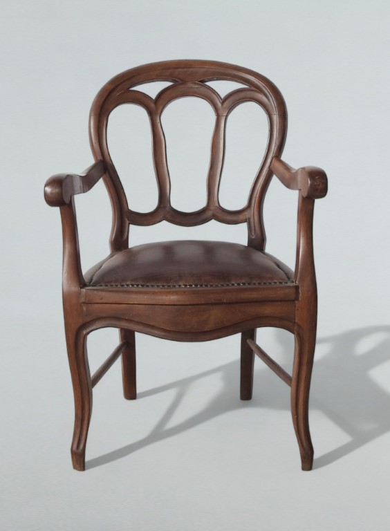 spalliera sagomata, braccioli a giorno, gambe mosse, sedile in pelle rossa