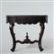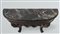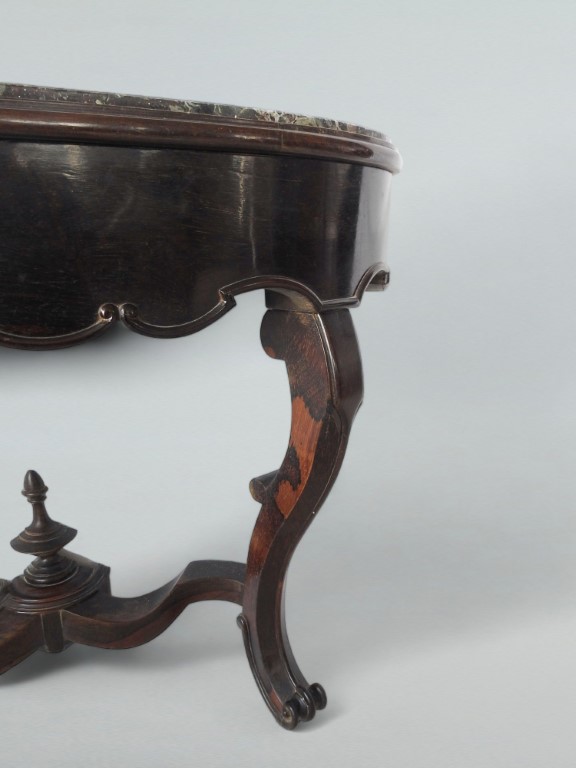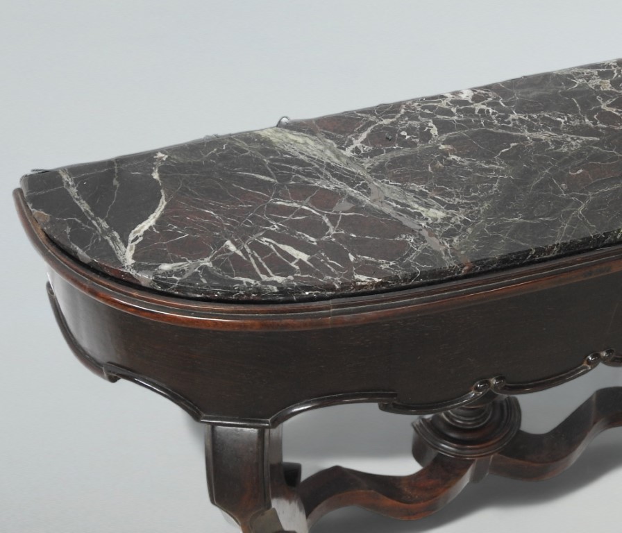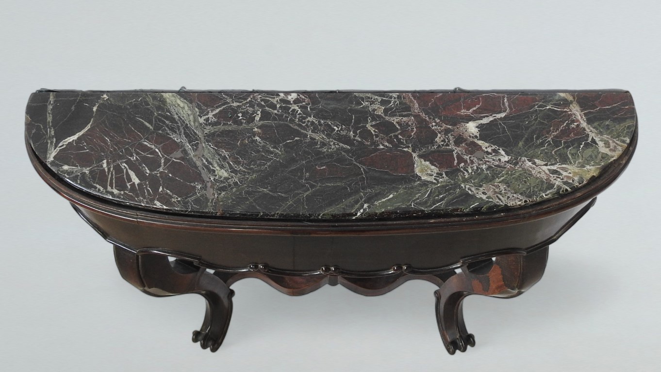 piano semicircolare in marmo verde Alpi, pendaglina sagomata, gambe a voluta riunite da crociera con vaso al centro