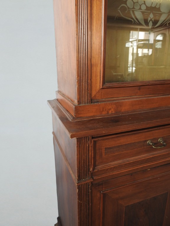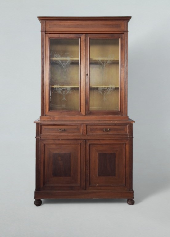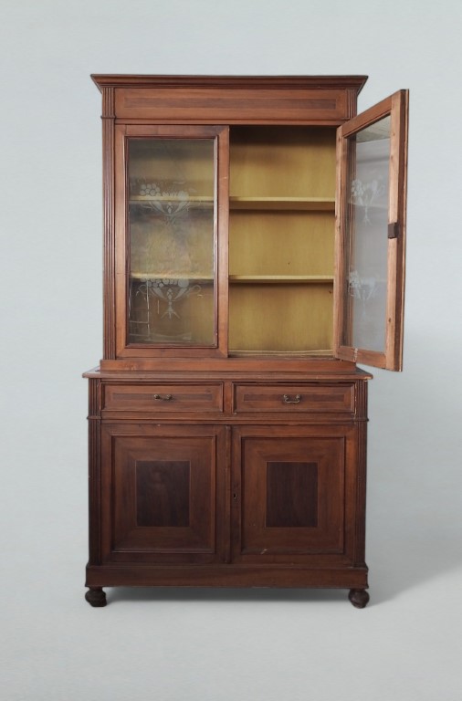 parte superiore con due sportelli e vetri molati a motivi floreali, parte inferiore con due cassetti e due sportelli, piedi a cipolla