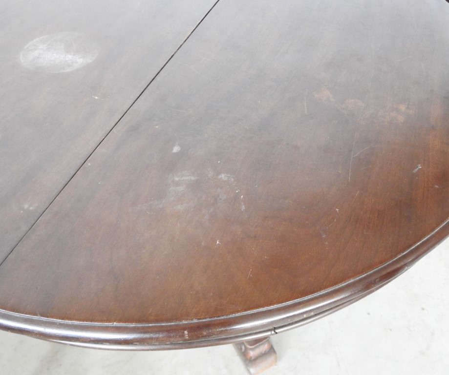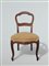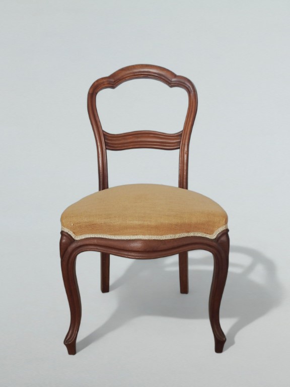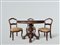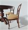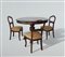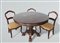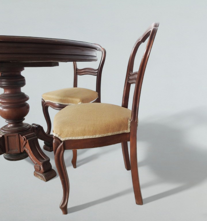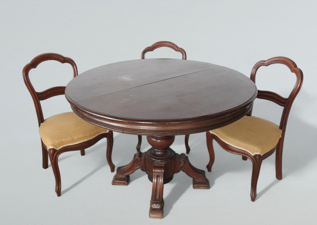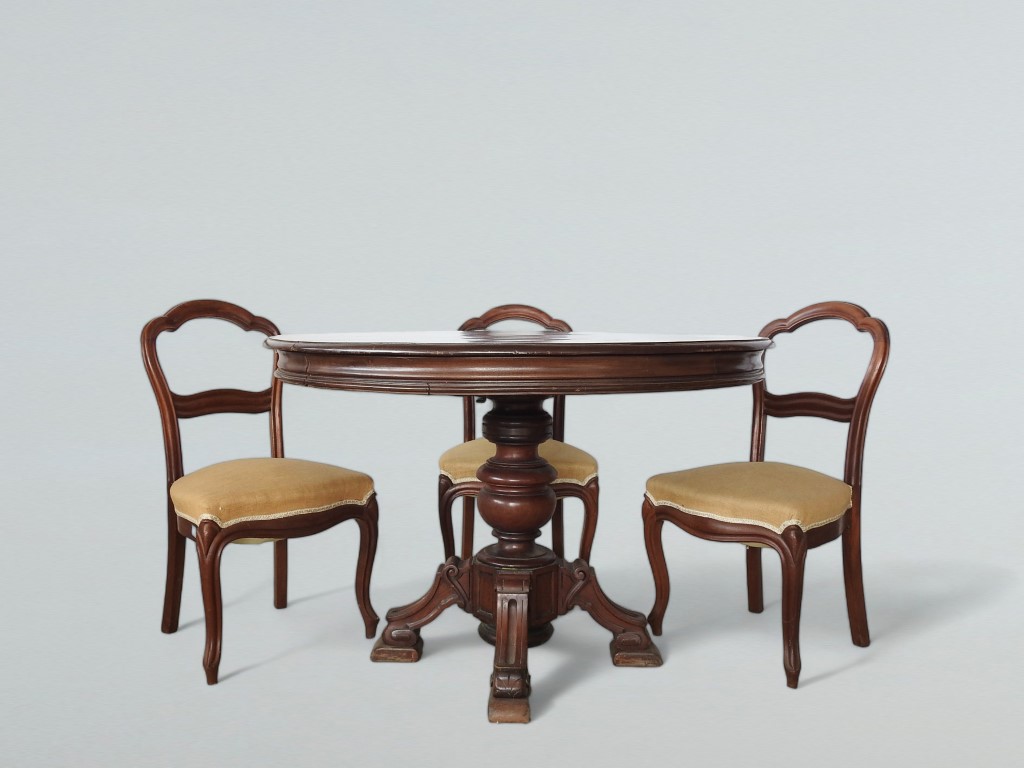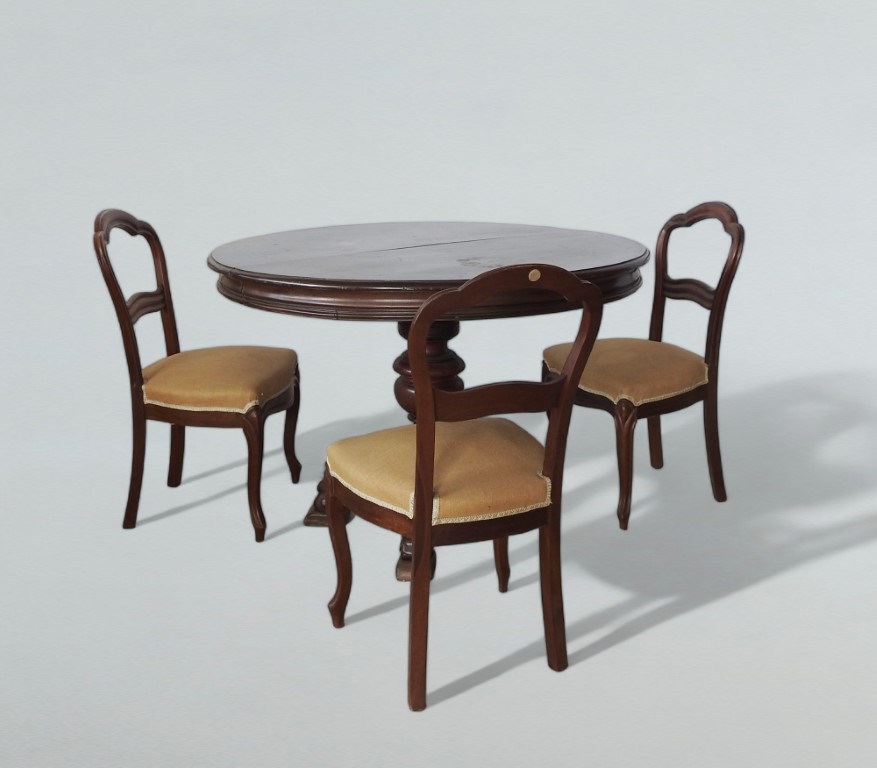 piano circolare, fusto a balaustro su tre gambe mosse e tre sedie in noce con spalliera sagomata, gambe anteriori mosse e posteriori a sciabola, ricoperte in tessuto avorio