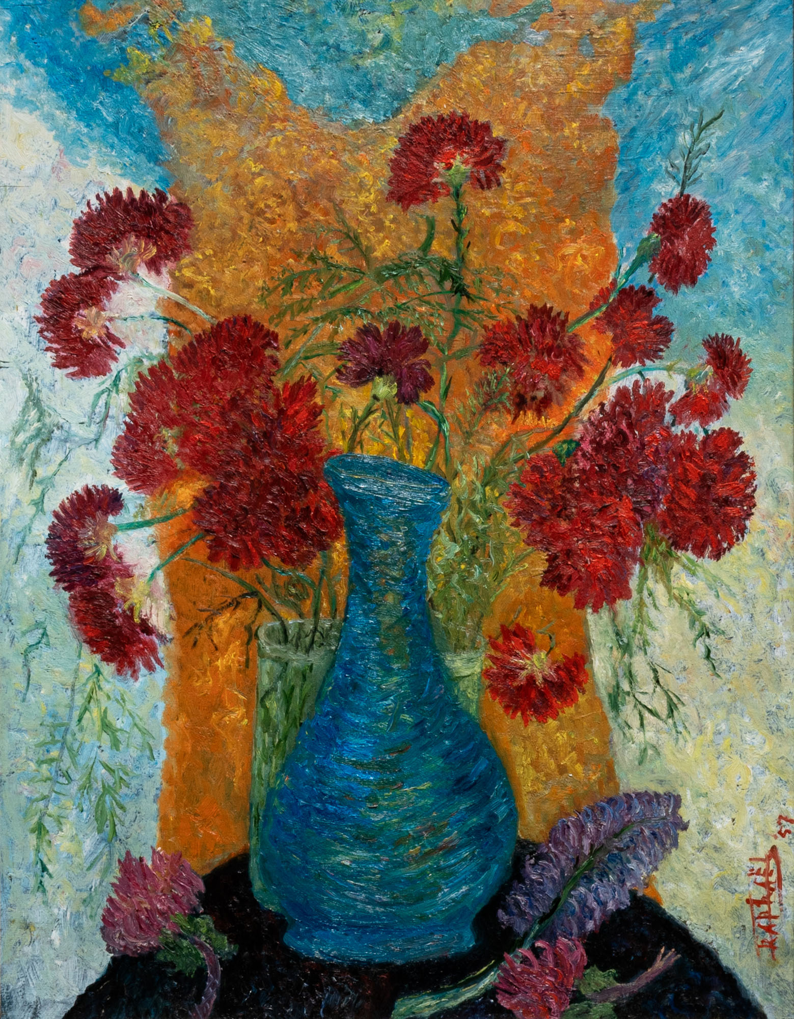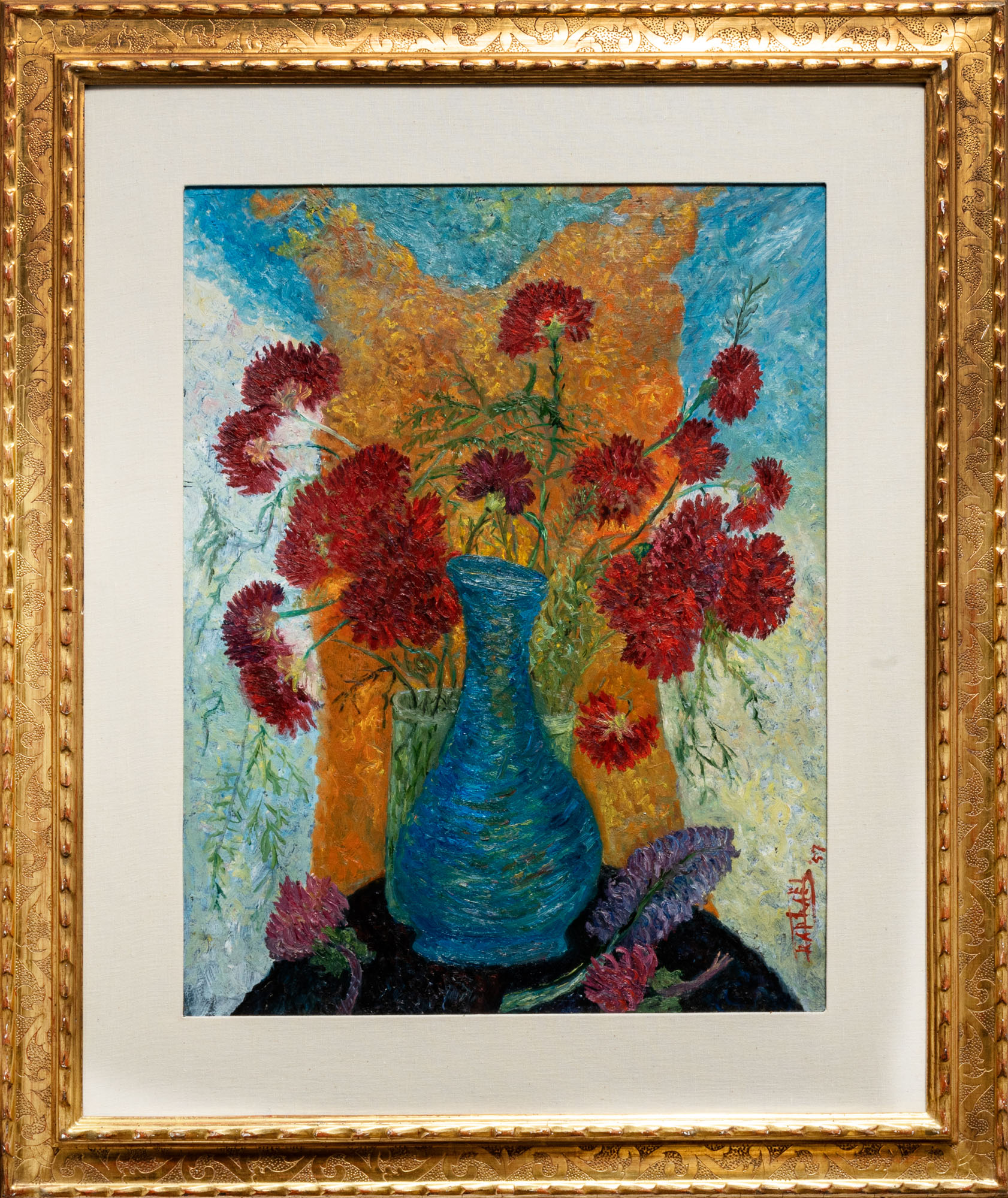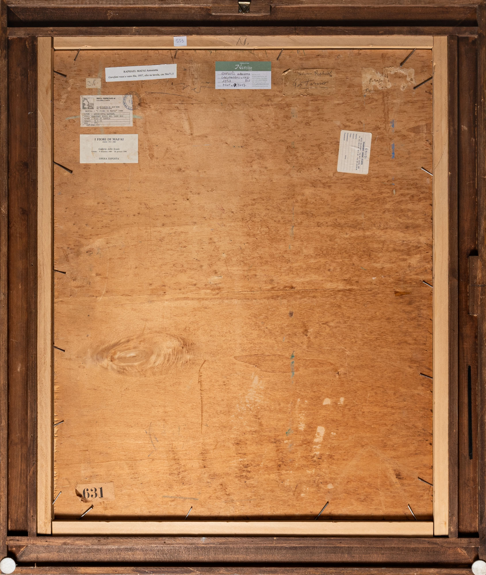 RAPHAËL MAFAI ANTONIETTA(1895 - 1975)Garofani rossi e vaso blu1957Olio su tavola71,5 x 56 cmFirmato e datato in basso a destraPROVENIENZA:Galleria d'Arte Netta Vespignani, Roma (etichetta e timbro al retro)Gallera dello Scudo, Verona (etichetta al retro)Galleria d'Arte Narciso, Torino (etichetta al retro)Collezione privata, TorinoESPOSIZIONI:1989, I fiori di Mafai, Galleria d'Arte Netta Vespignani, Roma (etichetta al retro)9 dicembre 1989 - 20 gennaio 1990, I fiori di Mafai. Dipinti 1931-1960, Galleria dello Scudo, Verona (etichetta al retro)