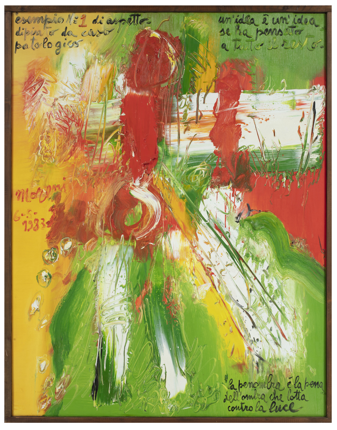 Mattia Moreni (1920 - 1999) Esempio n. 1 di aspetto dipinto da un caso patologico: una idea è una idea solo se ha pensato a tutto il resto; la penombra è la pena dell'ombra che lotta contro la luce, 1983