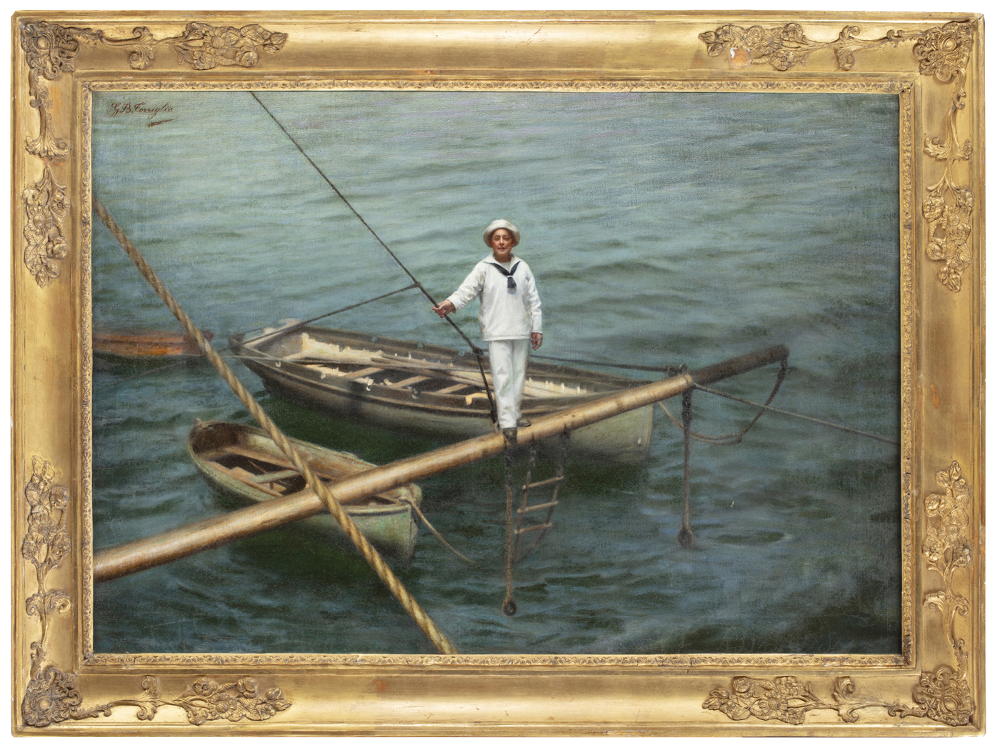 Il dipinto in asta si distacca dalle composizioni di genere in interni che rappresentano grande parte della sua produzione, per misurarsi con il tema del mare, così caro alla cultura ligure, forse a partire da un ritratto realistico.