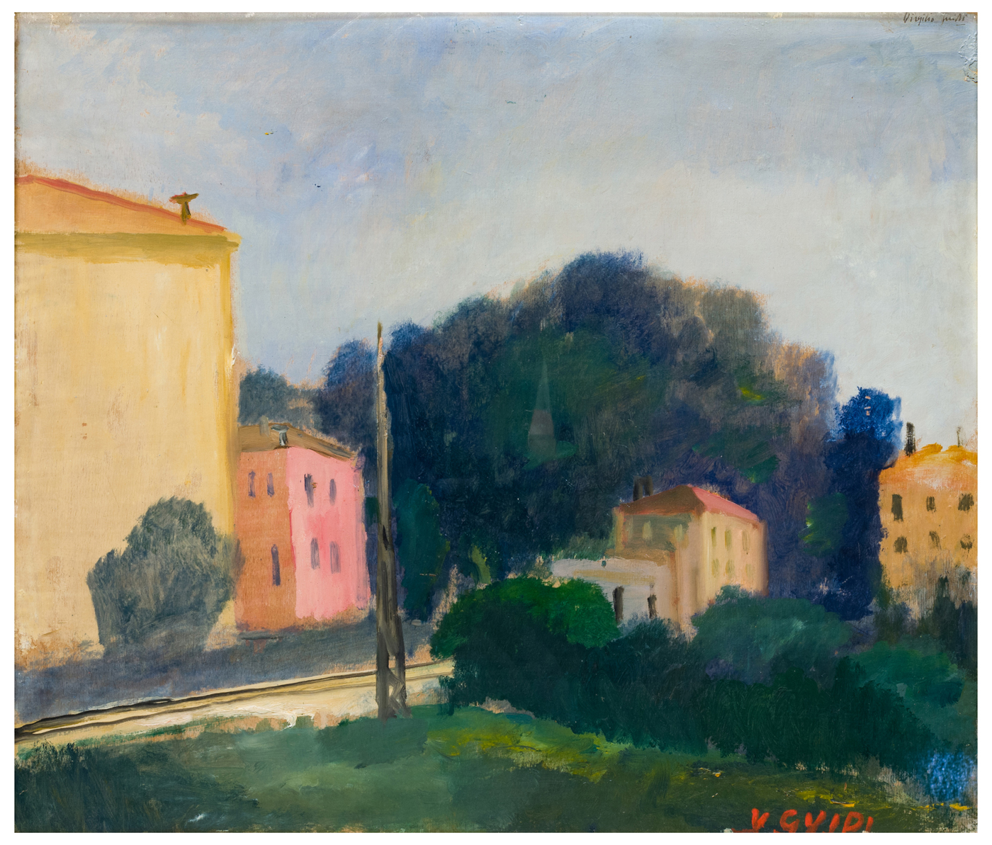 Rispetto ai paesaggi romani, caratterizzati da una volumetria semplice e solida, i paesaggi veneti – sia quelli lagunari, sia quelli dell'entroterra – complice certamente il contatto con la luce locale, rarefatta e trasparente, sono caratterizzati da una pennellata più mossa che tende a sfaldare la consistenza formale per far emergere la vibrazione luminosa. Una luce che, come in quest'opera, appare tutta intrinseca alla materia pittorica, alleggerendo i semplici volumi delle case e conferendo una consistenza soffice al cielo e alle fronde degli alberi. Un'esperienza, quella della luce veneta, che condurrà Guidi negli anni verso una progressiva sintesi astrattiva in cui il paesaggio tenderà sempre più a divenire lirica apparizione.
