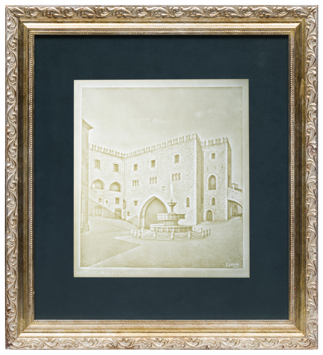 In asta, un esemplare di filigrana artistica in chiaroscuro, realizzata da Luigi Casoni, per la storica Cartiera Miliani, di Fabriano, sul disegno, rielaborato, della Fontana Sturinalto di Fabriano. Come ricorda Annarita Librari, "Con Giuseppe Miliani (1816 - 1890), nipote di Pietro (1744 - 1817), fondatore della ditta Miliani, la cartiera si ingrandisce, la carta da disegno si afferma come la migliore, tanto che alla esposizione di Londra nel 1851 viene premiata, e la carta valori comincia ad essere la specialità della fabbrica fabrianese. Alla morte di Giuseppe la cartiera era già un grande complesso, ma sarà il figlio Giambattista (1856-1937) ad operare l’effettiva trasformazione da azienda artigianale ad industriale (...). Giambattista alle conoscenze tecniche unisce un’ampia visione dell’organizzazione industriale grazie ai frequenti viaggi che, fin da giovanissimo, compie in diverse nazioni europee e in Nord America. Nel 1889 riceve la Legion d’onore per aver presentato, all’esposizione di Parigi, le migliori filigrane per i biglietti di banca. Per le filigrane di Fabriano, ancor prima del riconoscimento parigino, esisteva un vero e proprio entusiasmo. Nel 1886 Ernst Kirchner di Francoforte sul Meno scrive: “Le vostre carte filigrane sono le più belle che io abbia mai veduto fino ad ora. Da quando posseggo questi veramente artistici fogli non oso più nemmeno guardare gli stessi prodotti della Germania. I ritratti, come pure i dettagli che li ornano sono di una finezza ammirabile, perfetta e formano ora il punto essenziale di questa modesta collezione che io curo con molto amor proprio”. Nel settore della Filigrana artistica in chiaro-scuro per banconote Giambattista, in un primo momento, per l’incisione su cera si avvalse del prof. Bianchi di Roma, medaglista dei Sacri Palazzi Apostolici, che direttamente da Roma inviava a Fabriano le cere commissionate. Successivamente, la sua lungimiranza e previdenza lo spinsero a dotare l’Officina Filigrane delle cartiere di Fabriano della sezione di incisione su cera, dove destinò giovani e abili artisti che riuscirono a soddisfare appieno le esigenze aziendali. Capostipite di questa scuola fu Serafino Cilotti (1868-1943), che realizzò opere di notevole impatto artistico, da considerare come una nuova forma di espressione d’arte figurativa su cera, Angelo Bellocchi (1880-1939) e Virgilio Brozzesi (1869-1946). Allievi di Cilotti possono considerarsi Aldo Frezzi (1885-1972), (...) Eraldo Librari (1907-1988) e Luigi Filomena. Luigi Casoni fu incisore delle Miliani fino al 1958, quando fu chiamato dalla Banca d’Italia per incidere le “testine” delle banconote." ( Annarita Librari, "Cera una volta... la Filigrana Artistica in chiaroscuro"). La storia della cartiera Miliani è stata ricostruita da Bruno Bravetti, nella monografia “Giambattista Miliani”, Affinità Elettive, 2010.