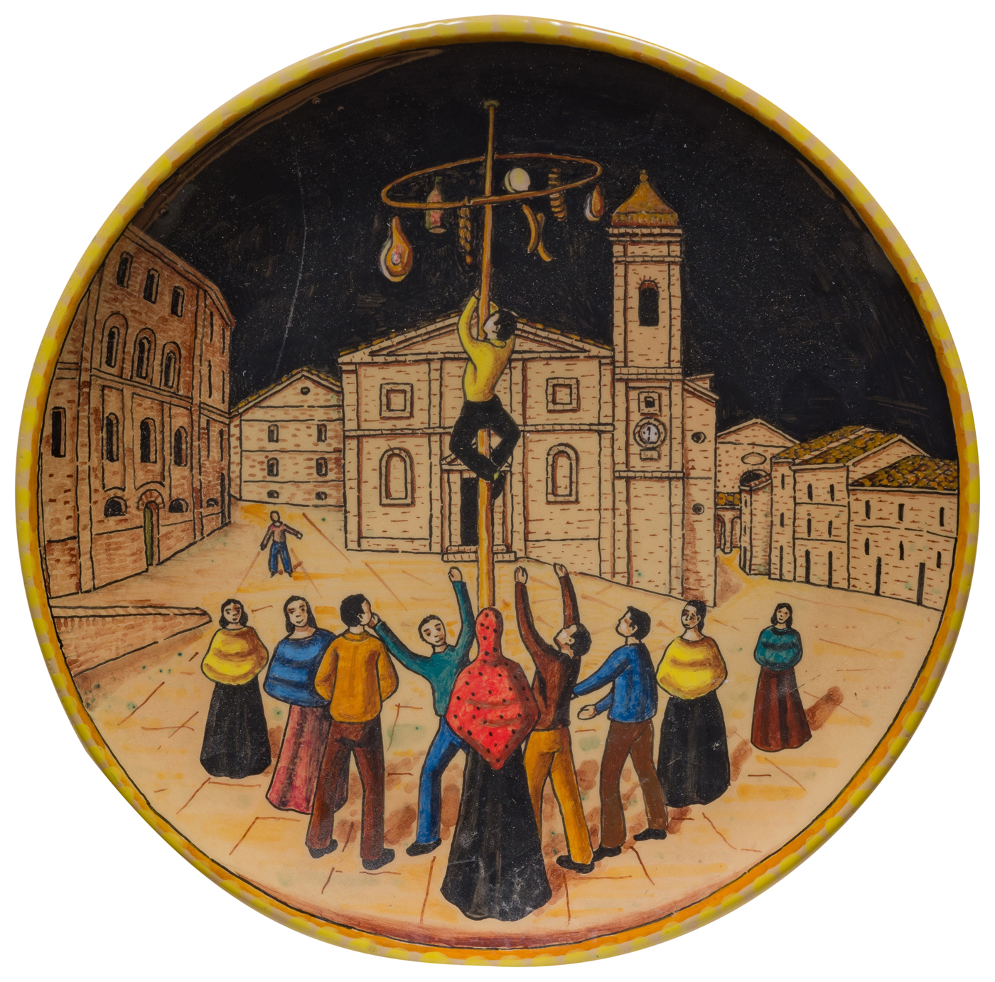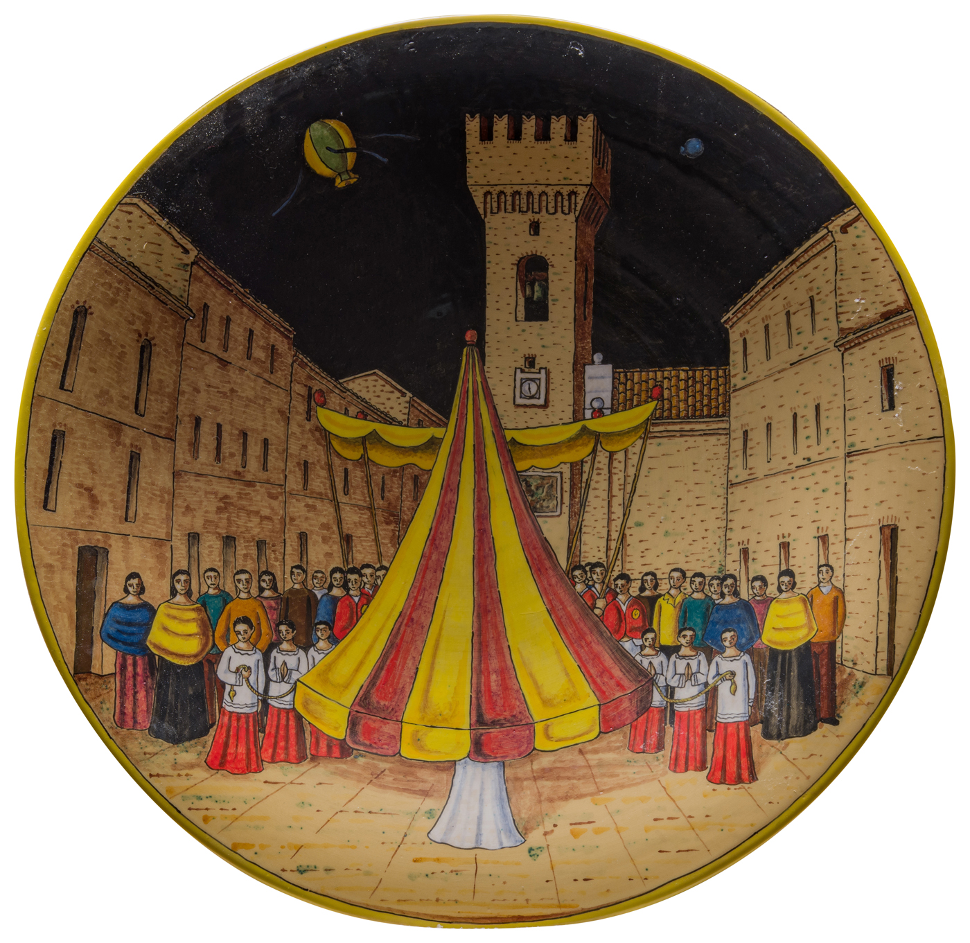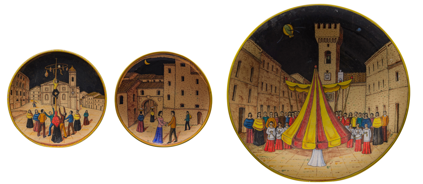 Alberto Cecchini (1935) Tre piatti: la Processione del Corpus Domini, l'Albero della Cuccagna, Porta San Domenico