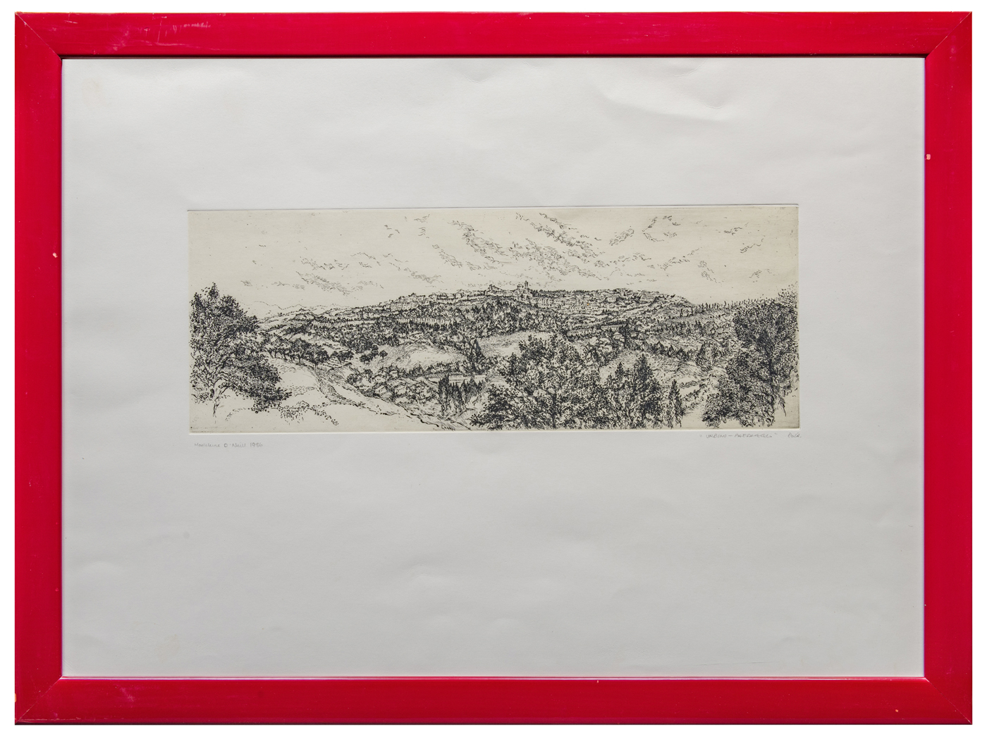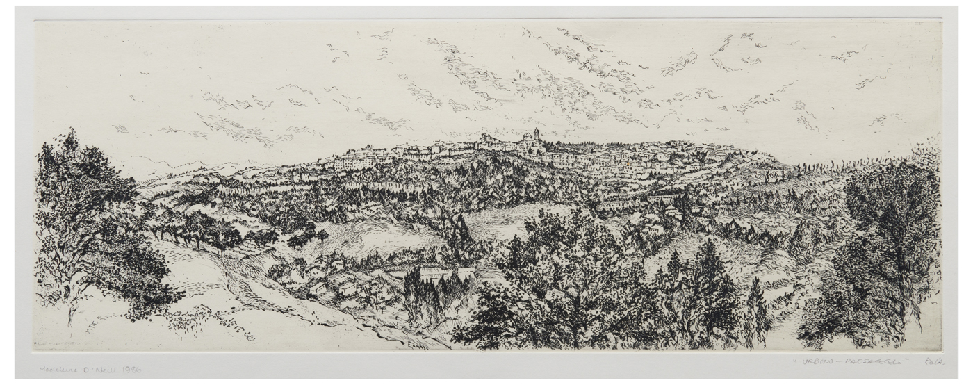 Madeleine O’Neill (1950 circa) Urbino - Paesaggio, 1986, con tre stampe di autori diversi