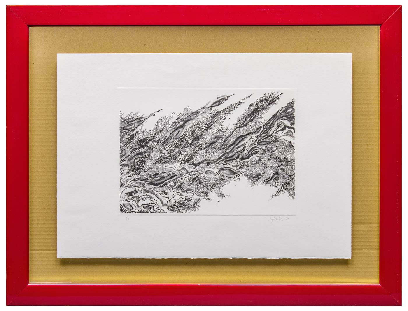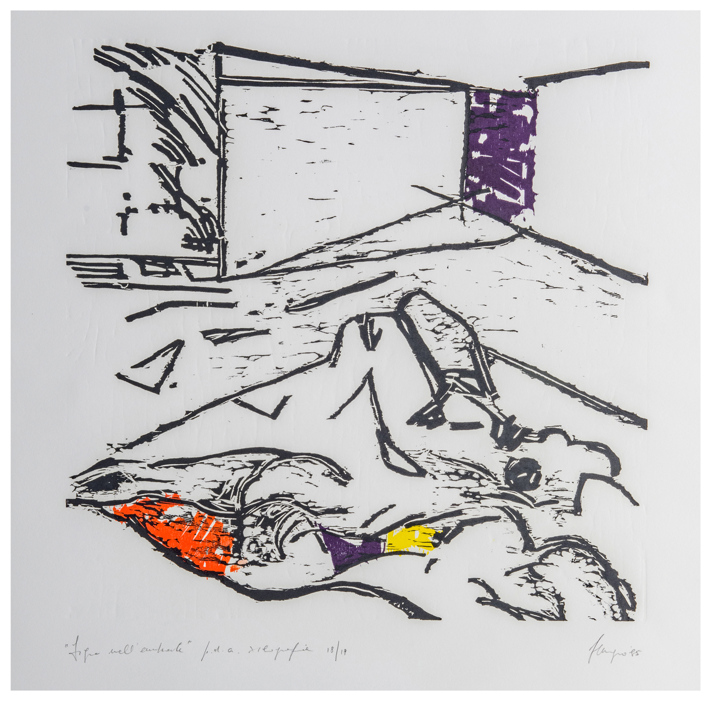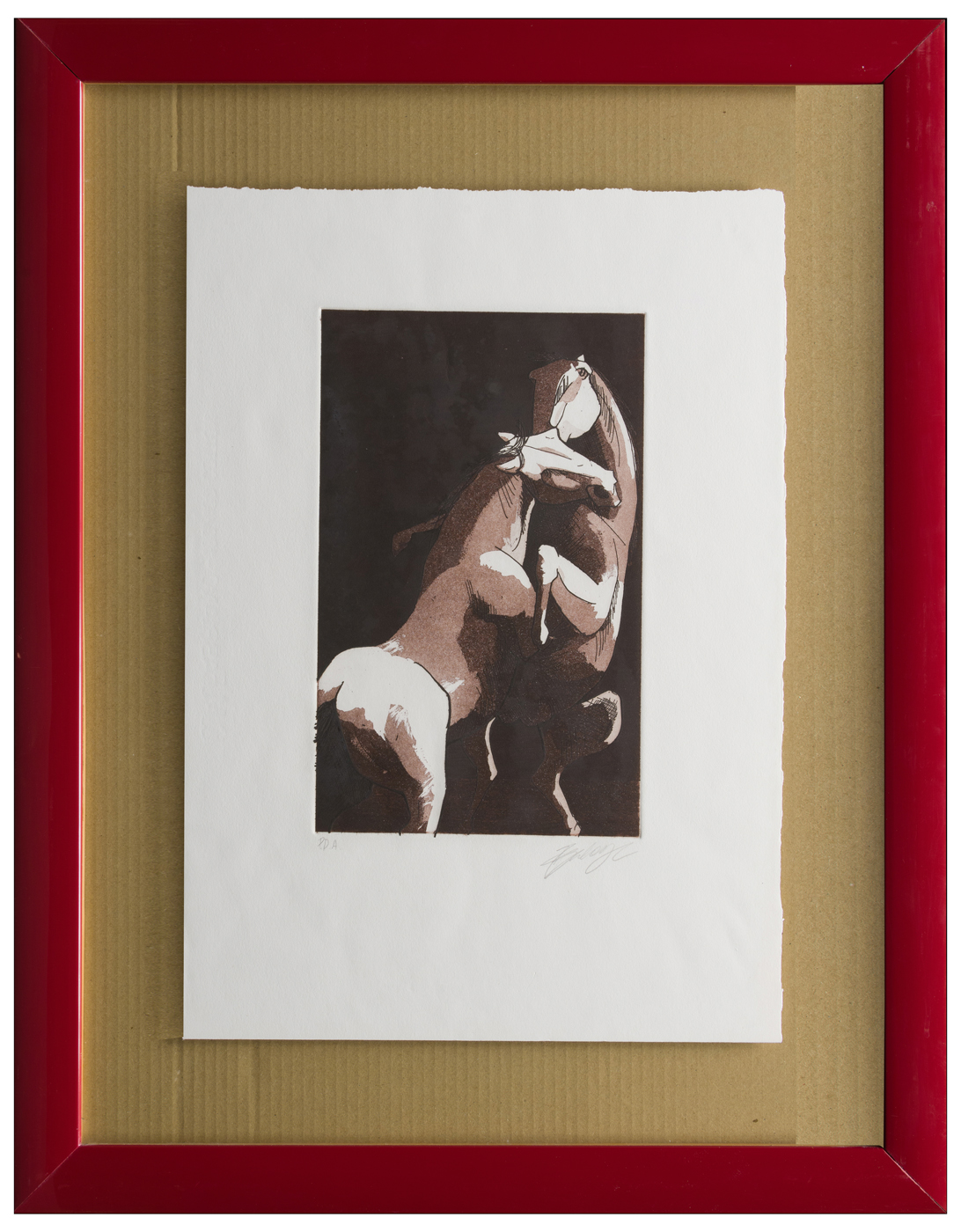 Madeleine O’Neill ha frequentato a Dublino il College of Art and Design, conseguendo la laurea in graphic design e specializzandosi nel campo dell’illustrazione. In seguito ha frequentato a Urbino un corso di calcografia, incisione e illustrazione: a questo periodo appartiene la nostra stampa. Il lotto include altre tre stampe firmate ma di autori non riconosciuti, raffiguranti "Due cavalli" (acquatinta e acquaforte su carta, con lastra di 30,3x18,8 cm), uno "Studio di vegetazione" (litografia su carta, con lastra di 30,3x18,8 cm), "Figure nell'ambiente (xilografia, prova d'autore, 50x70,4 cm).