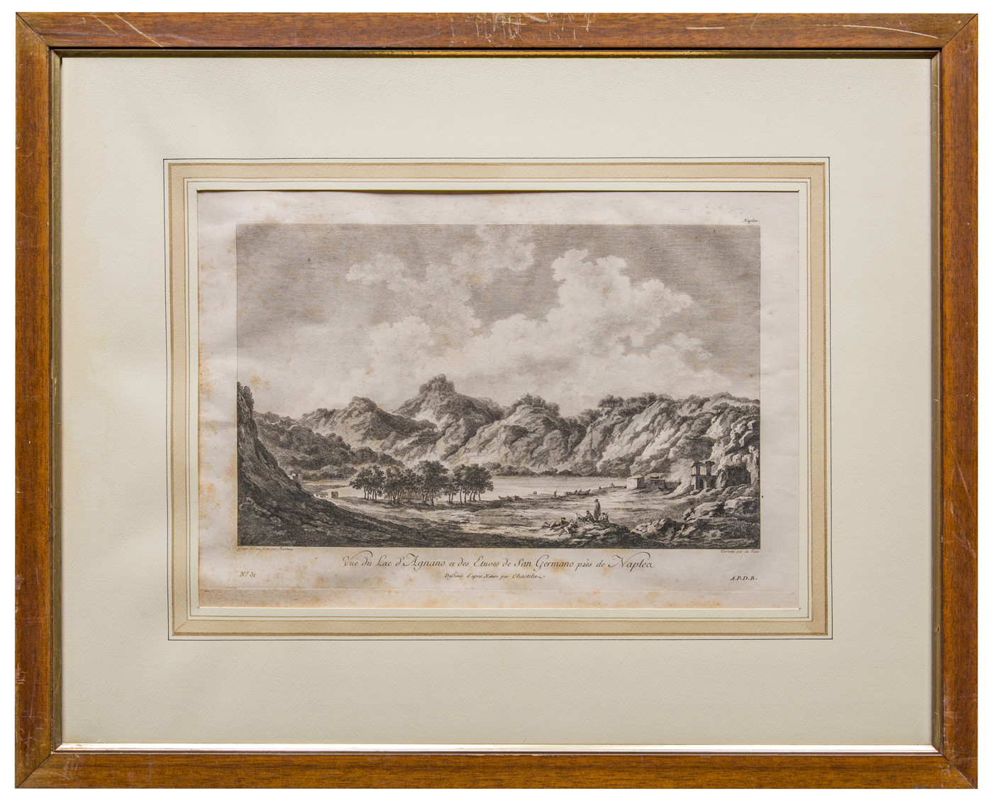 Altre iscrizioni: titolo in esteso in lastra ("Vue du Lac d'Agnano et des Etuves de san Germano, près de Naples"), tavola ("51")