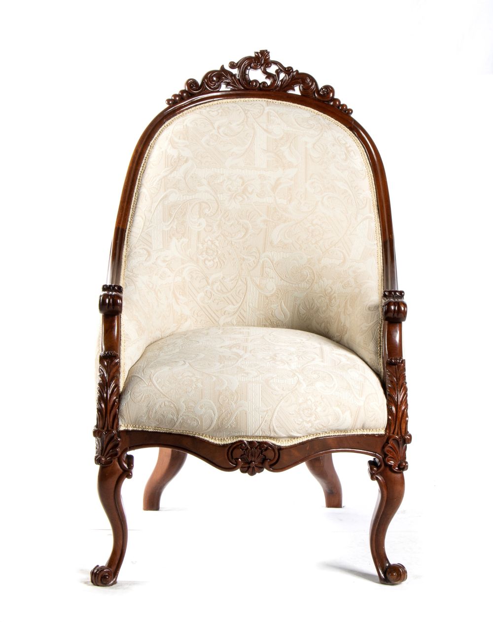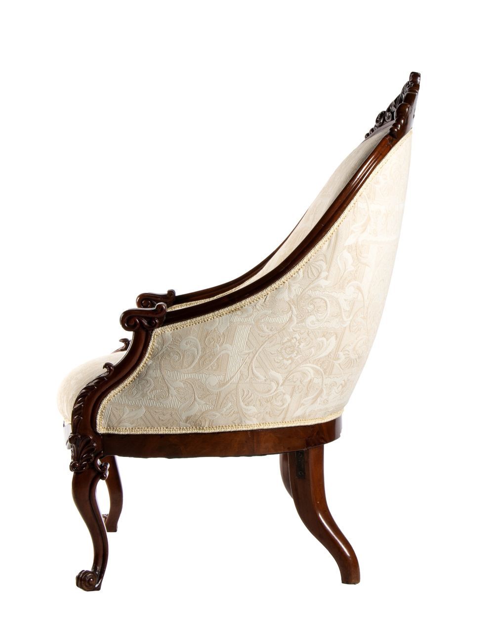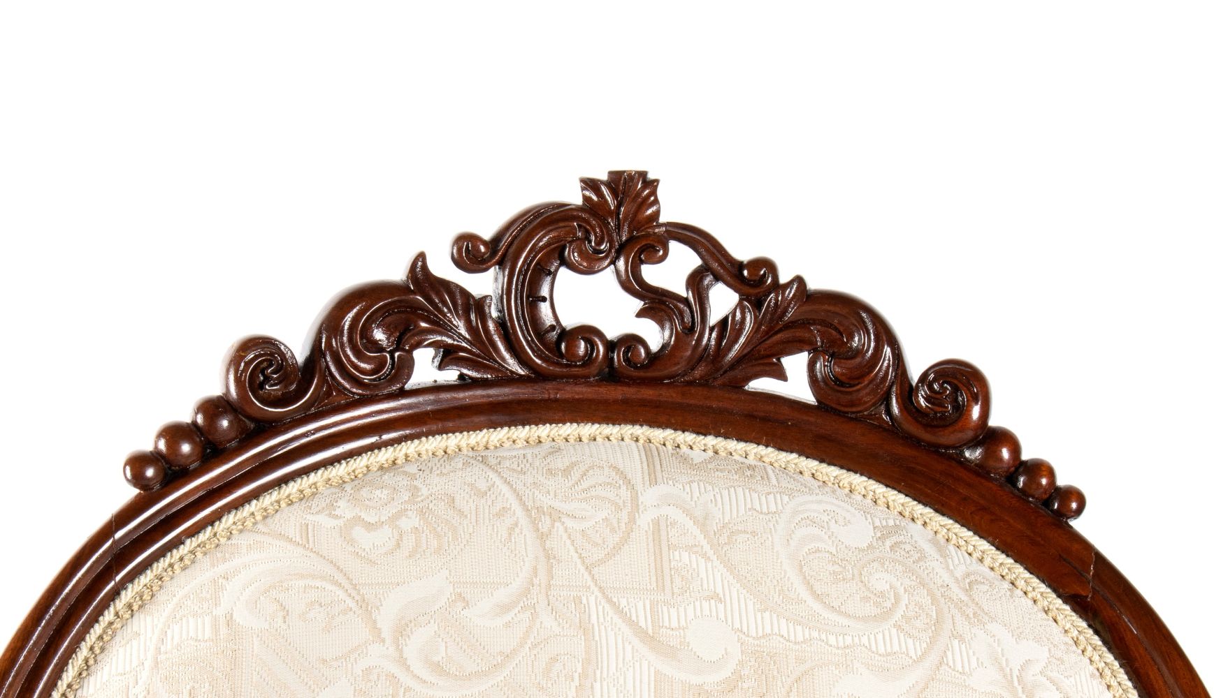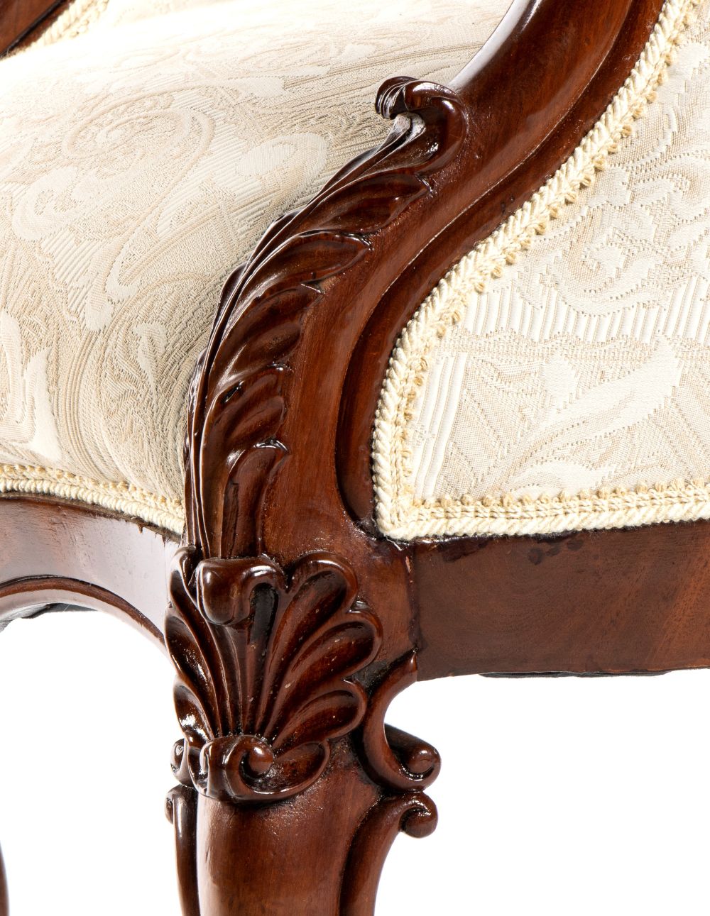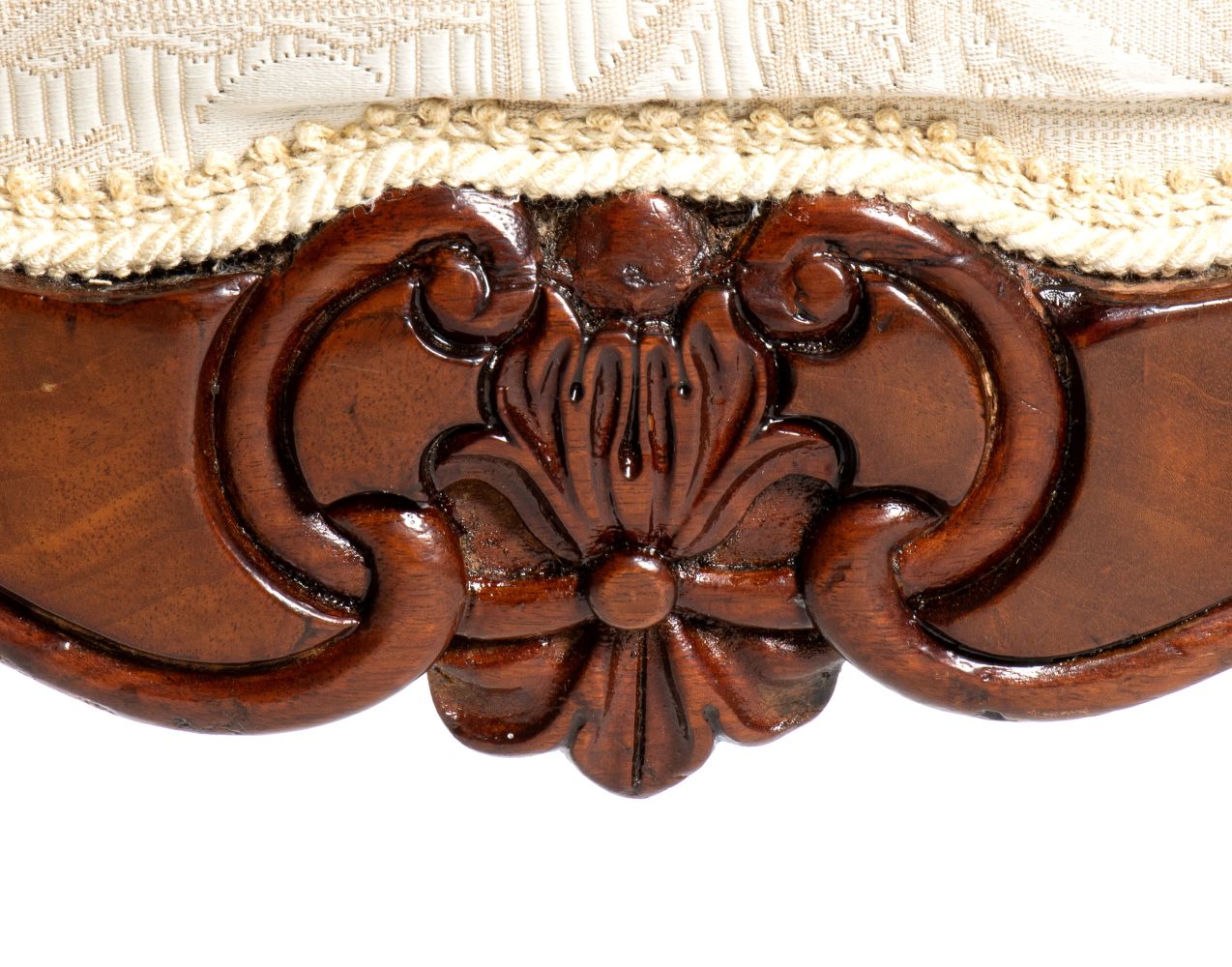 in legno di mogano, finemente intagliata a motivi floreali, restaurata e tappezzata recentemente.