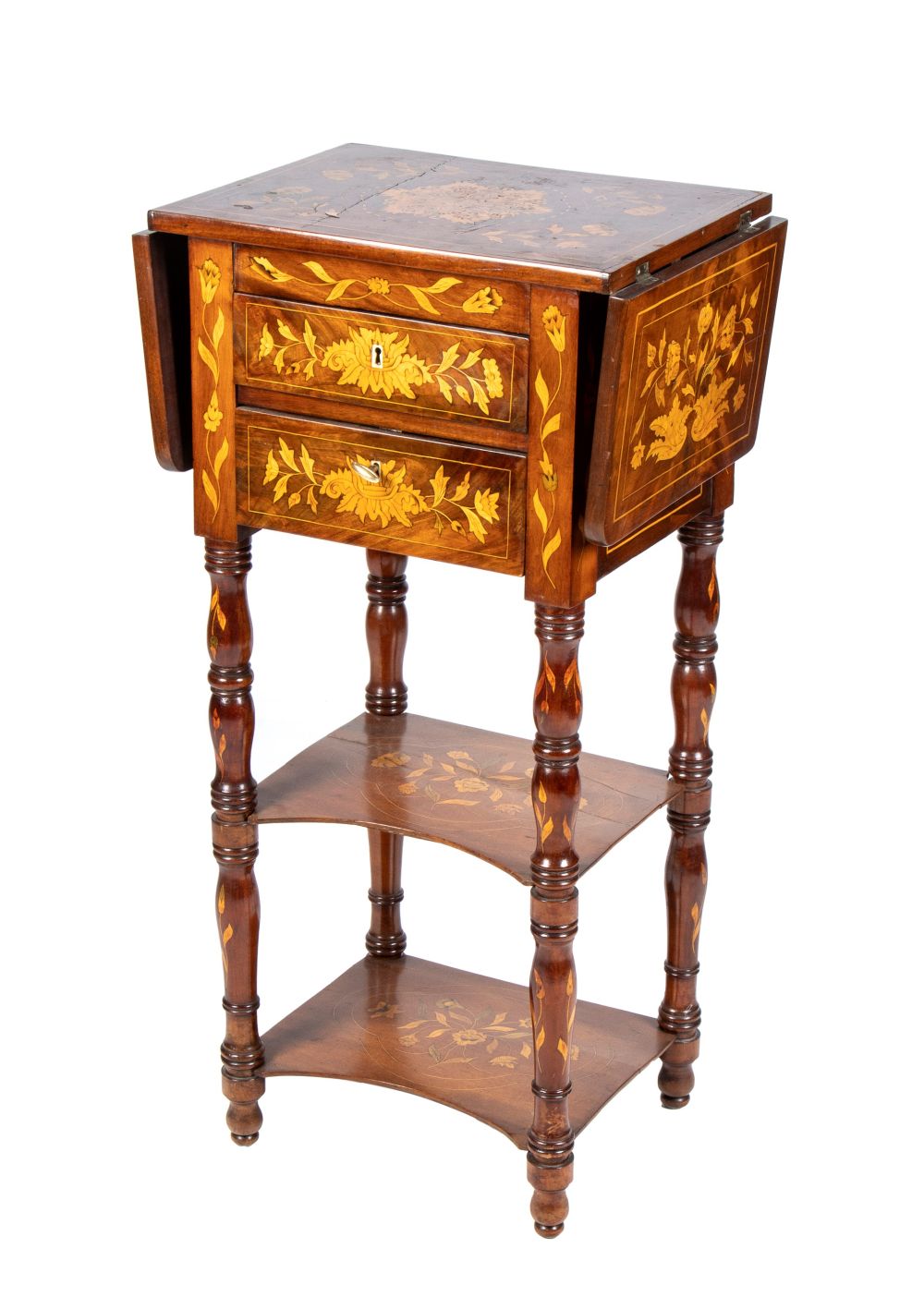 tavolo da centro, in mogano e piuma di mogano, con due alette laterali, due cassetti e due ripiani. Completamente intarsiato a motivi floreali in legno di bosso.