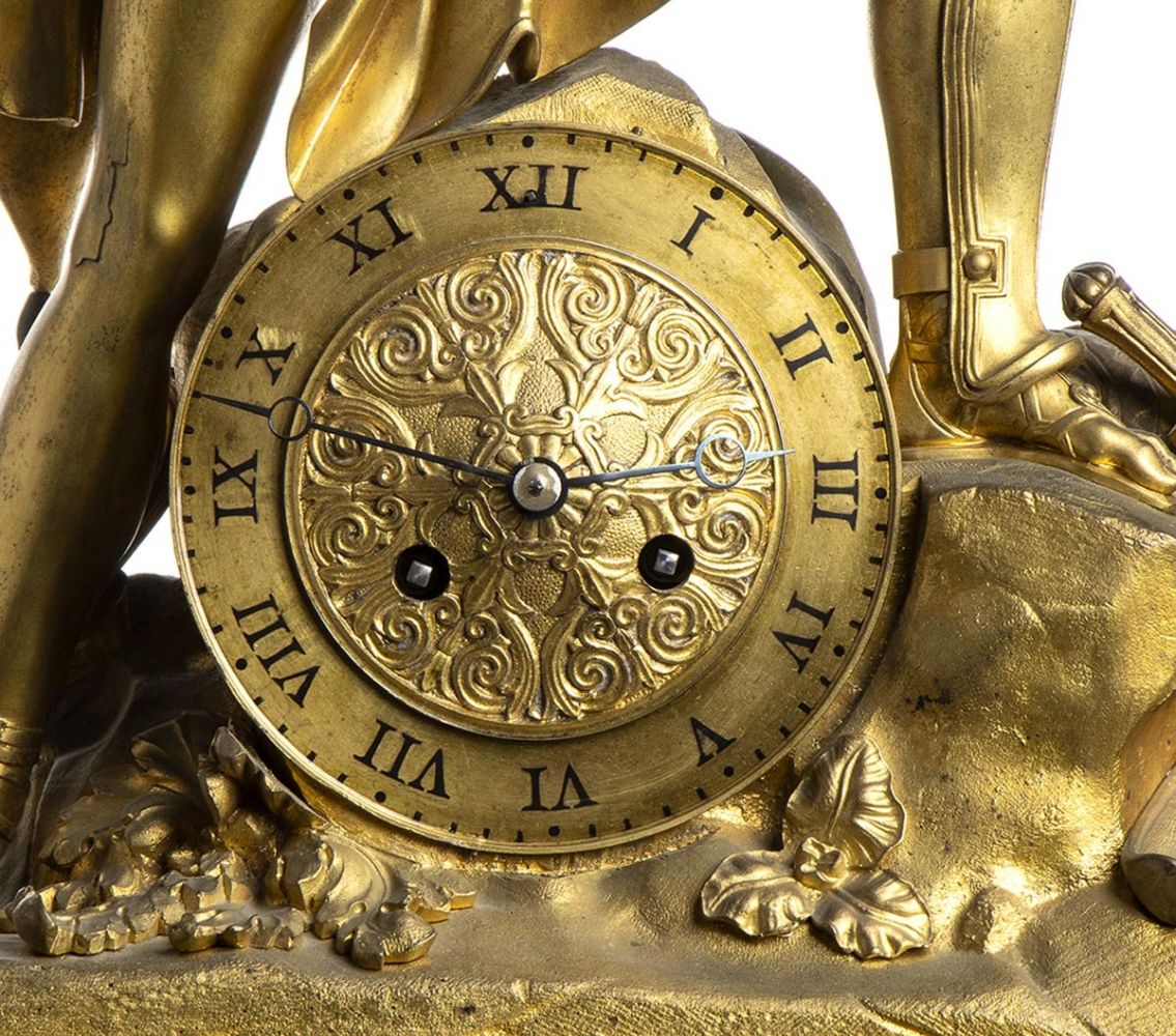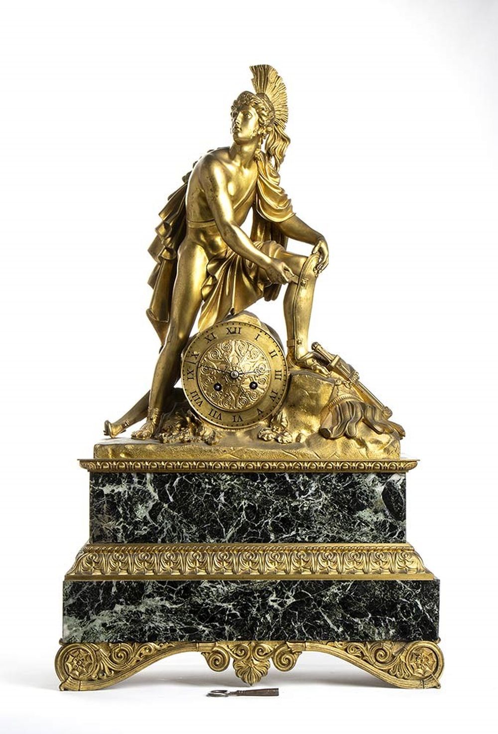 cassa con basamento rettangolare in marmo verde e bronzo dorato, sormontata da una raffigurazione di Achille in bronzo dorato. Quadrante circolare con numeri romani a due fori di carica con numeri romani. Movimento con sospensione a filo, regolatore a pendolo e suoneria delle ore e delle mezze su campana.