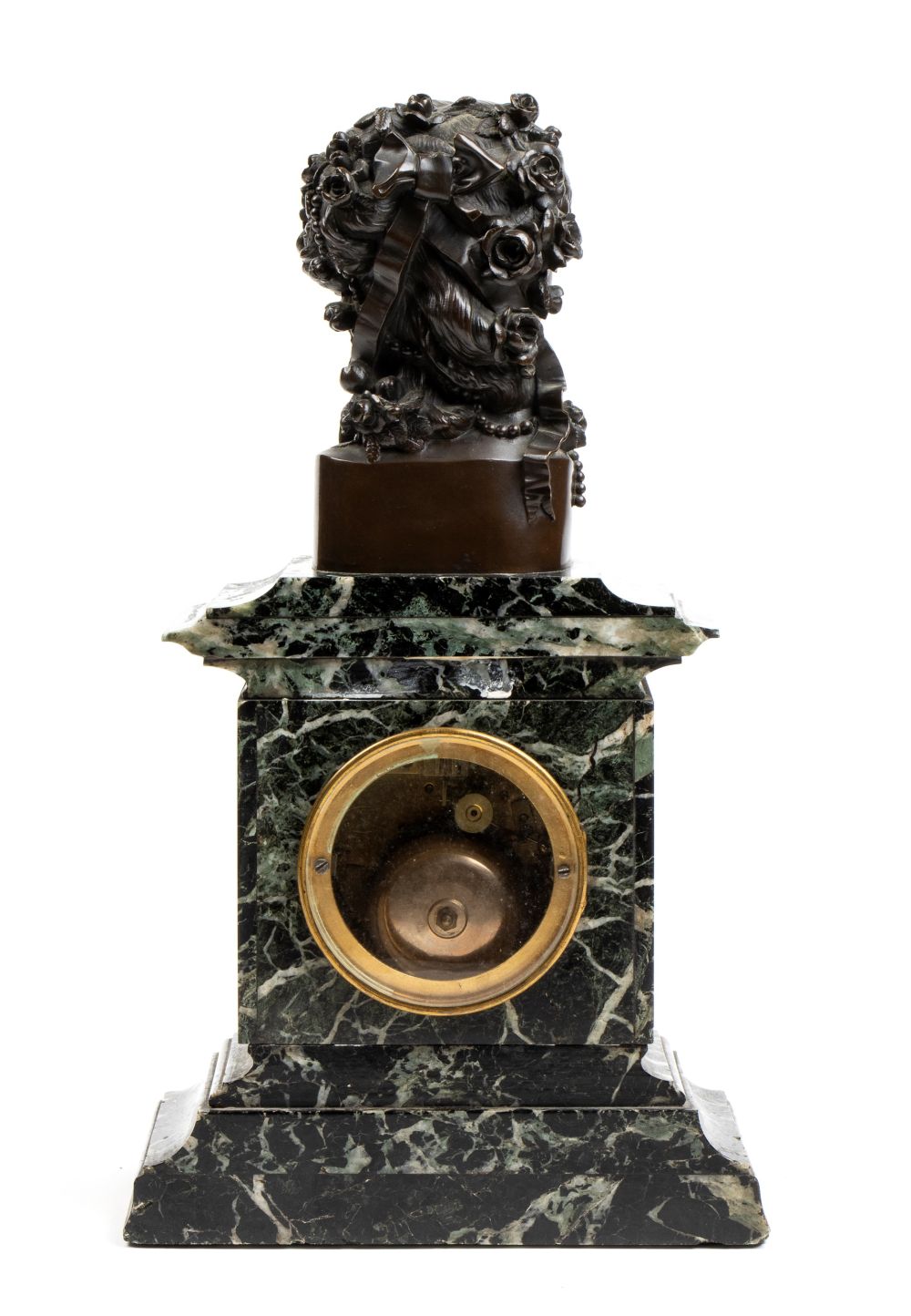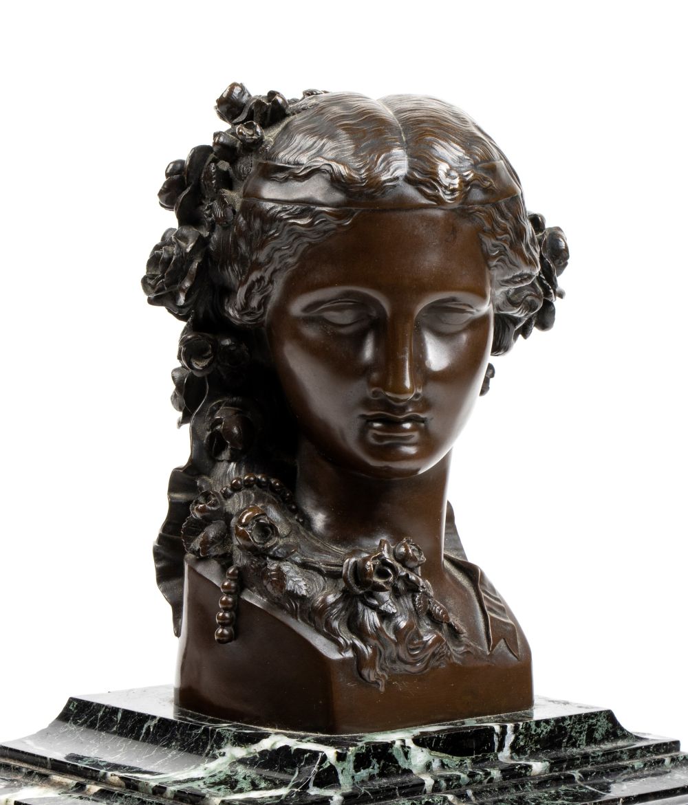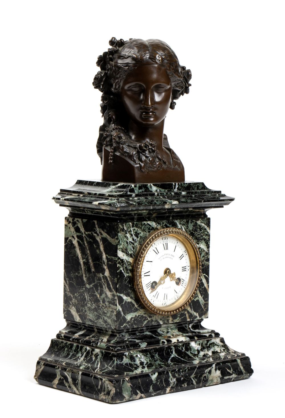 base in marmo verde alpi, sopra la quale è collocato il busto di una giovane donna in bronzo patinato. Quadrante circolare in smalto bianco con numeri arabi a due fori di carica, movimento con sospensine a molla con regolatore a pendolo e suoneria delle ore e delle mezze su campana firmato "V. Paillard". Victor Paillard (1805-1886), tra i più grandi bronzisti del XIX secolo, fondo la sua casa di bronzi e arredi nel 1835 e vinse la medaglia d'oro all'esposizione di San Pietroburgo nel 1849 e a quella di Londra nel 1851.