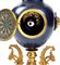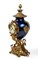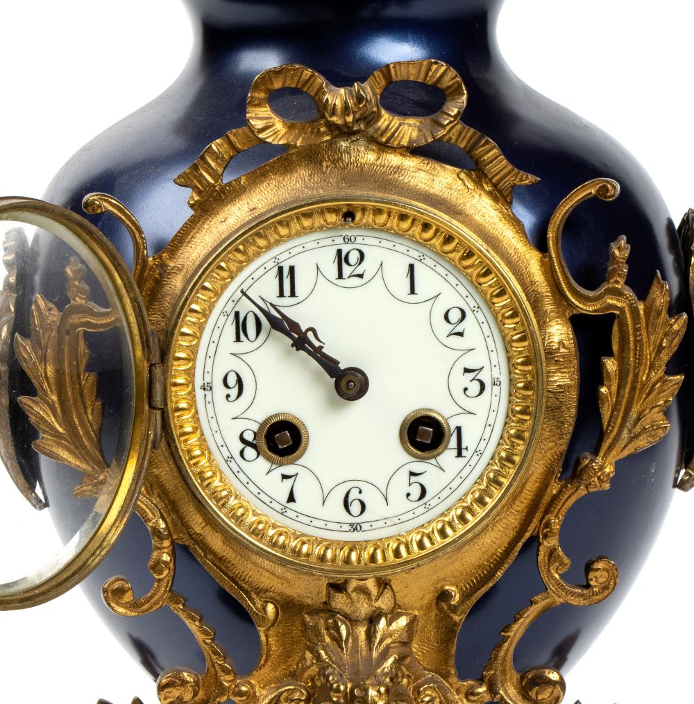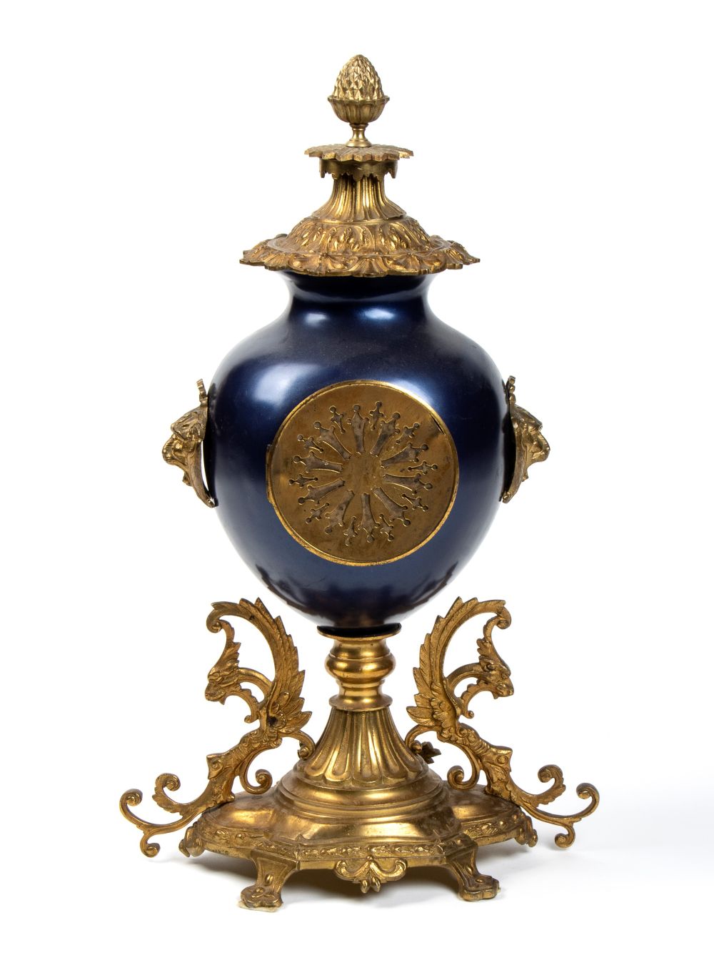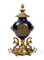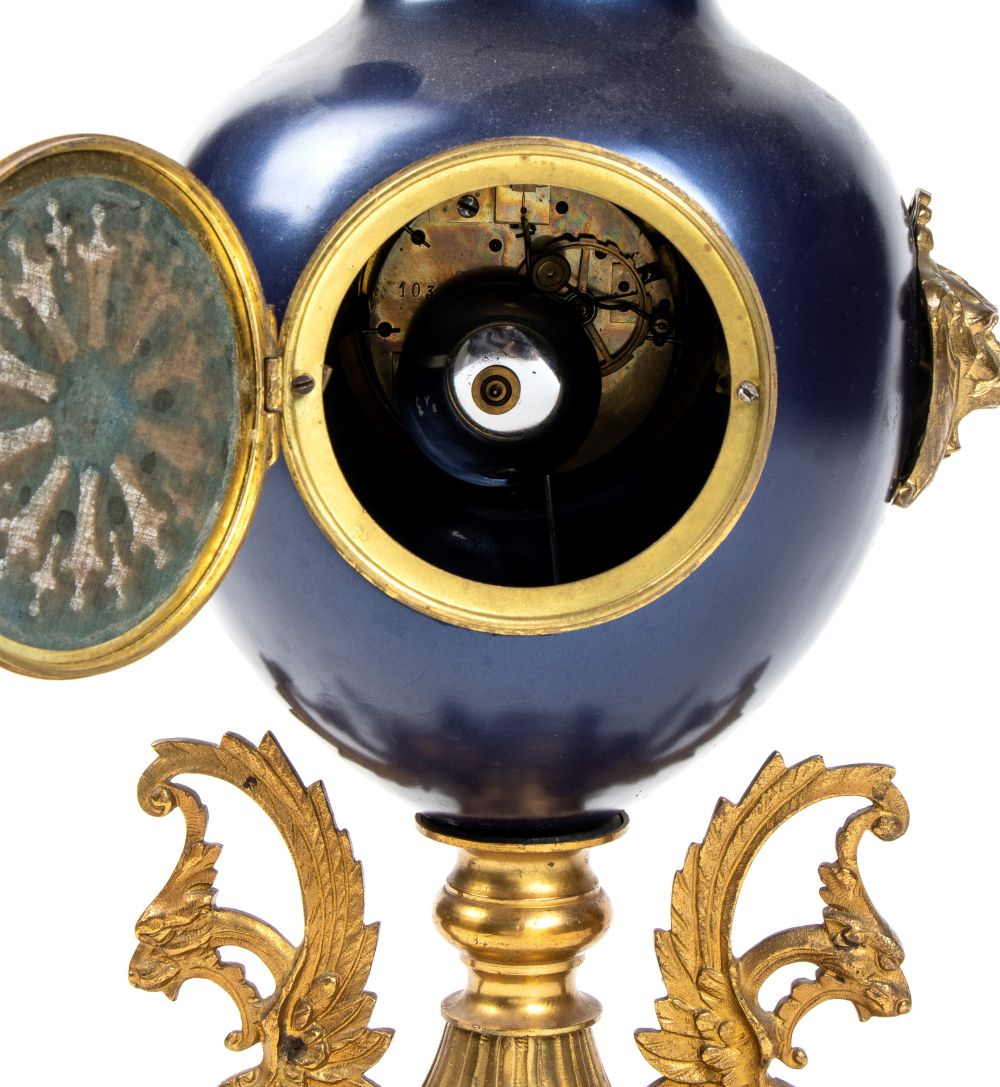 Altezza x larghezza x profondità: 53 x 30 x 20 cm. basamento in bronzo dorato con quattro piedi a volute fogliate e grifoni laterali, sopra il quale si innesta un vaso in metallo laccato nei toni del blu, cimato da un coperchio con fastigio e pigna. Quadrante in smalto bianco con numeri arabi, movimento con regolatore a pendolo e suoneria delle ore e delle mezze su campana.