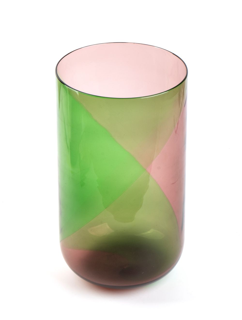 Altezza x diametro: 35,5 x 20 cm. Peso: 1945 gr. con sottili sovrapposizioni parziali in rosa e verde, disegnato da Tapio Wirkkala per Venini. In vibroincisione con iscrizione: Venini Italia tw.
