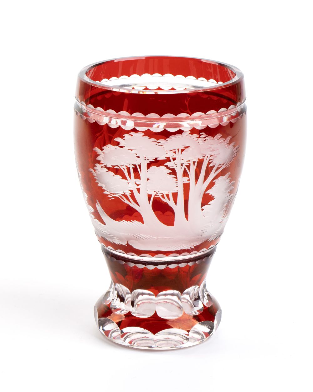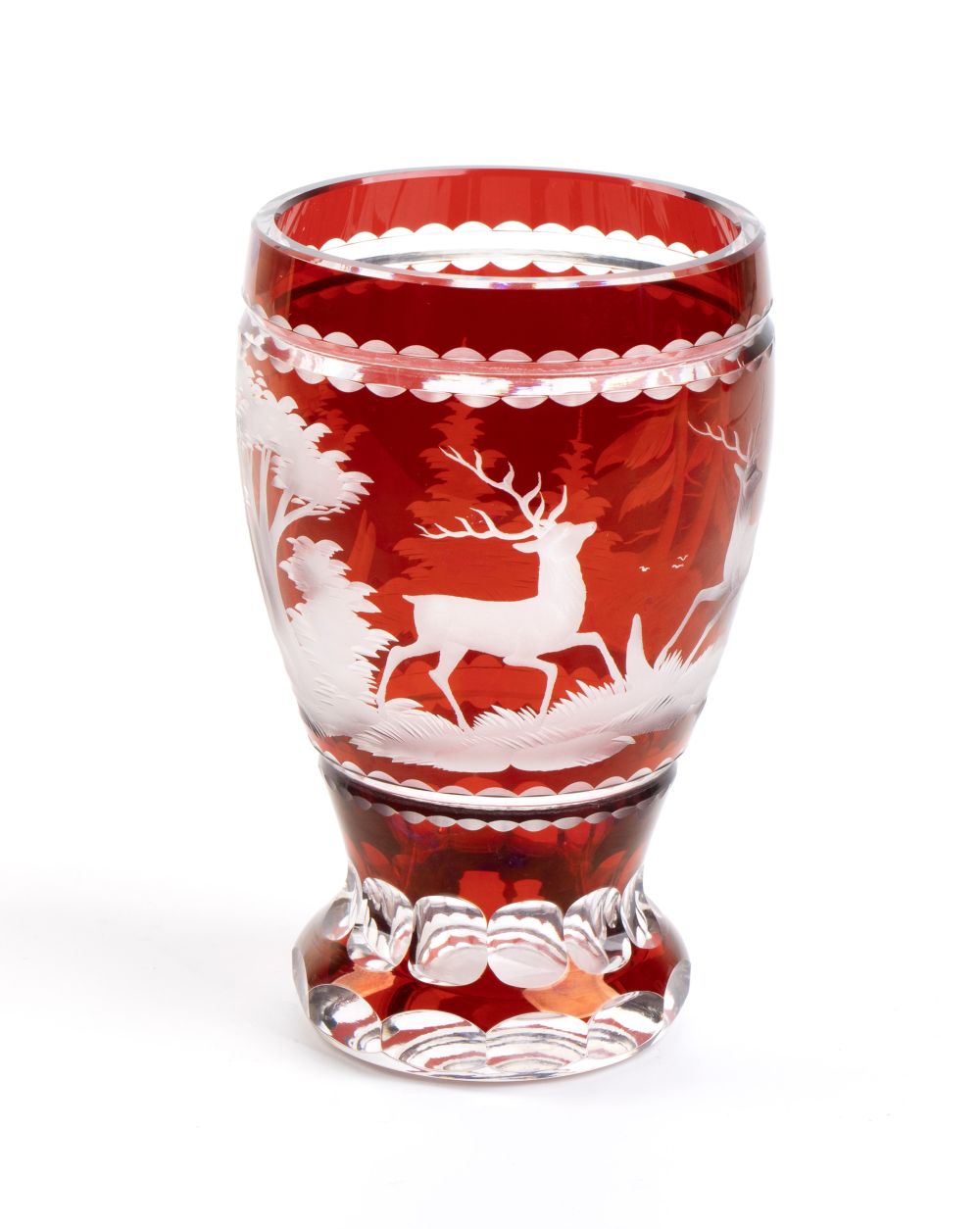 di colore rubino, molato e inciso con paesaggi e cervi in stile Biedermeier.