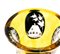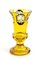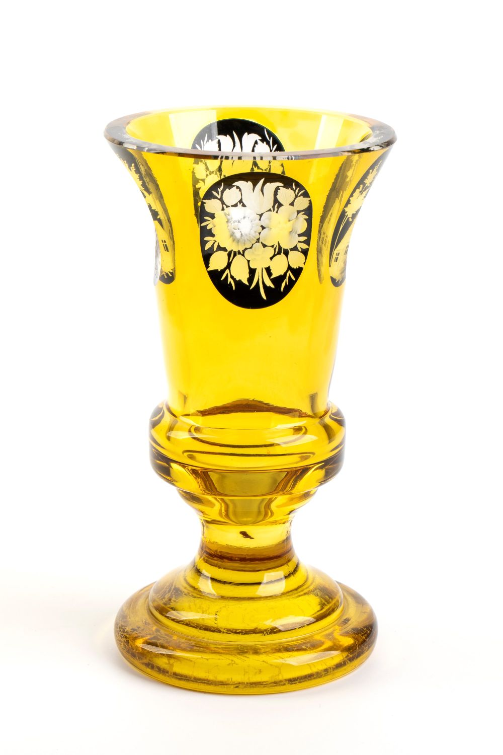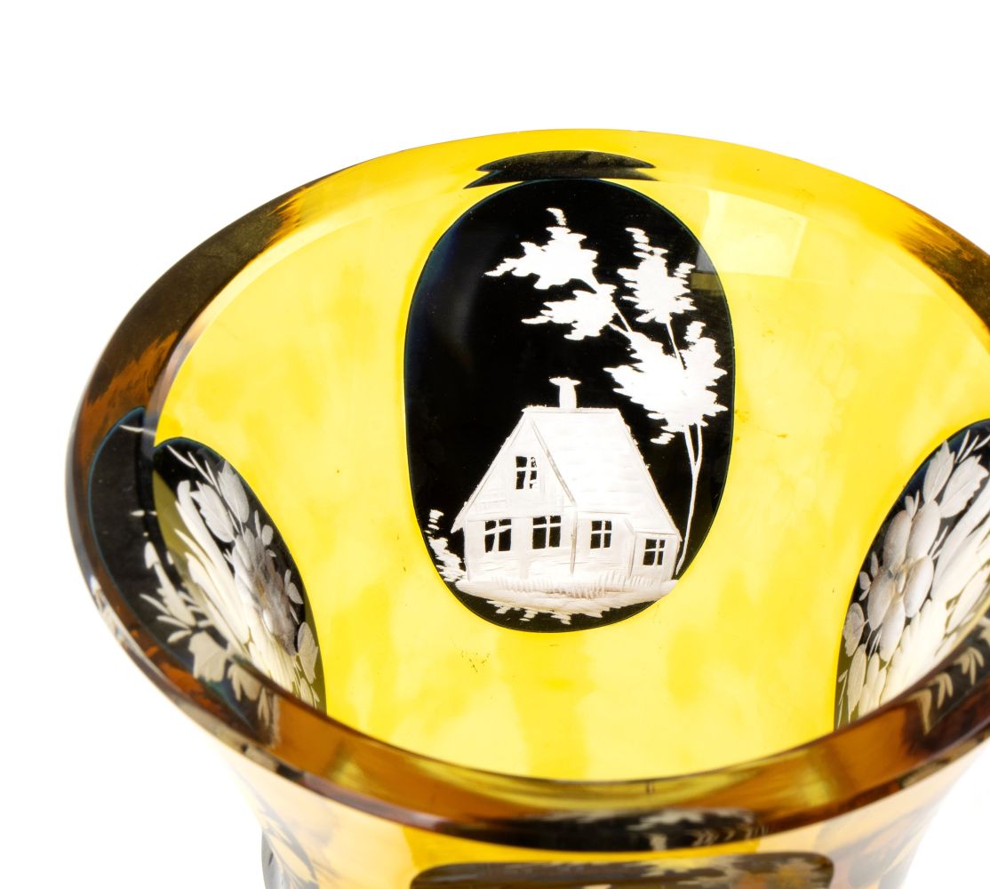 di colore giallo, molato e inciso con decori floreali e paesaggi in stile Biedermeier.