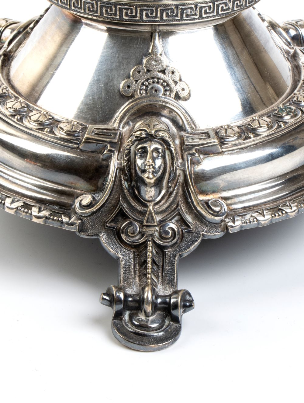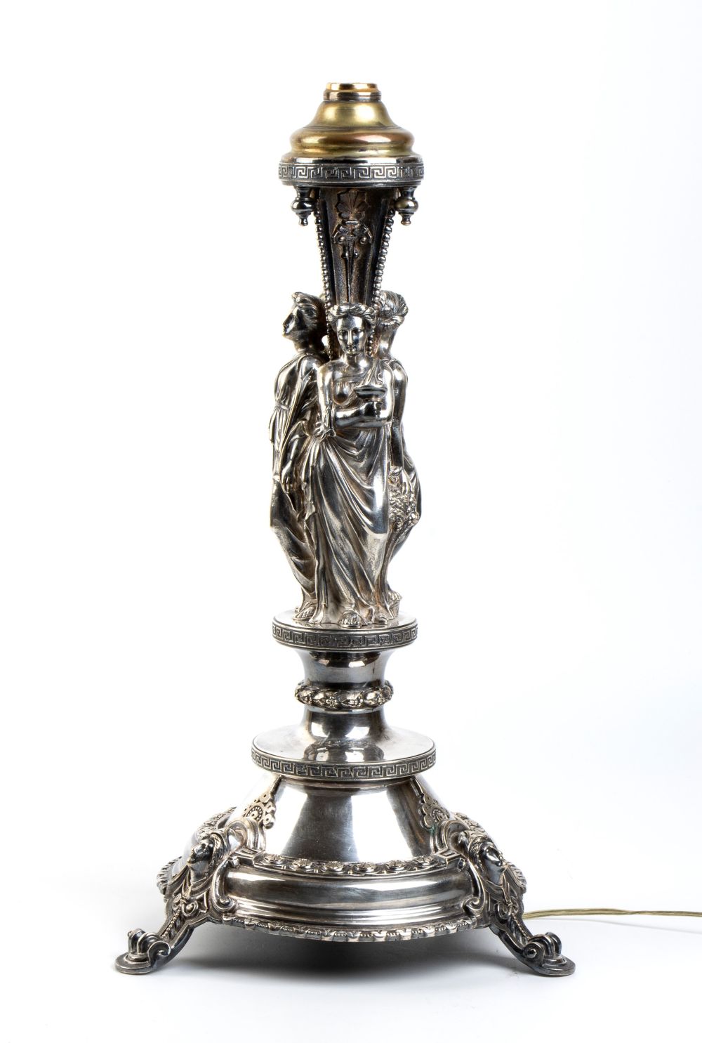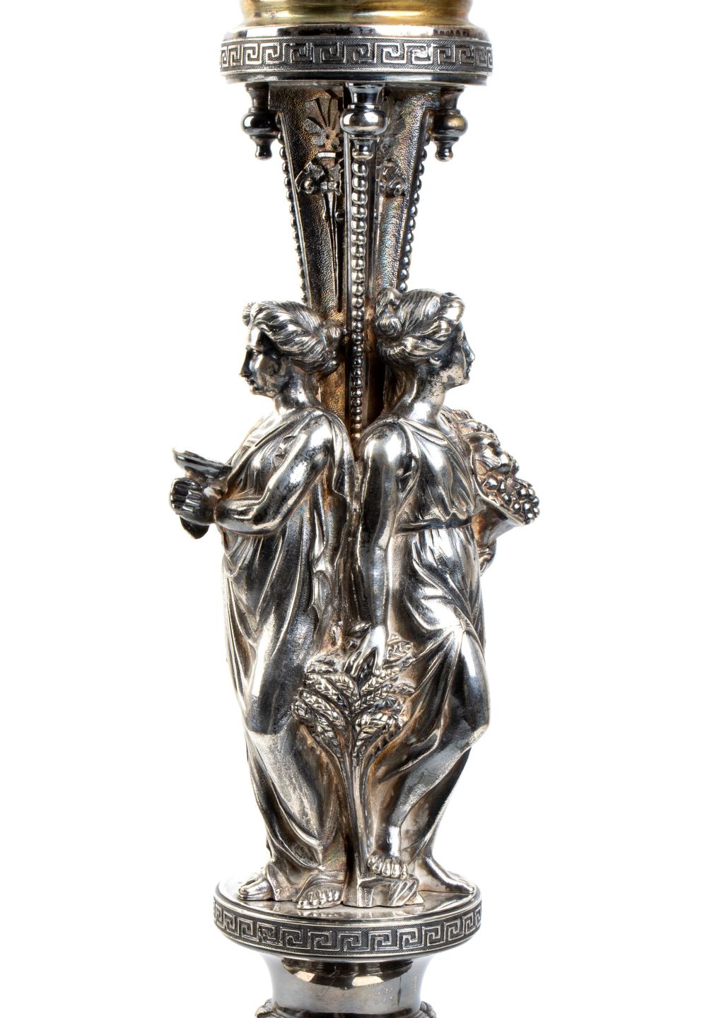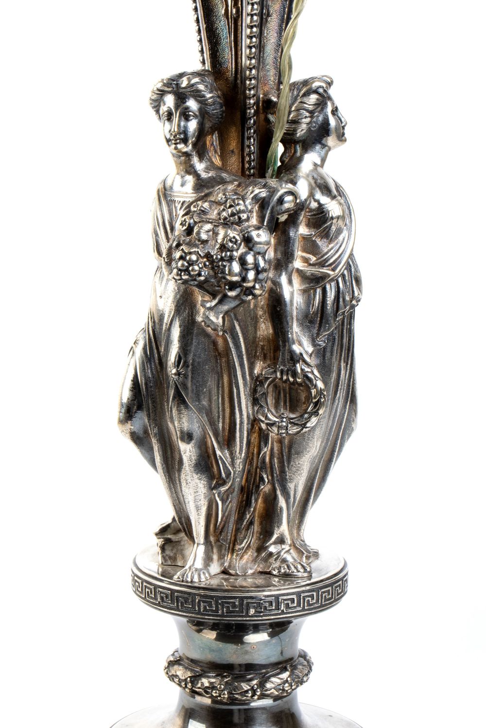 in metallo argentato (e.p.n.s. Electro Plated Nichel- Silver), base circolare e fusto decorato con tre figure classiche.