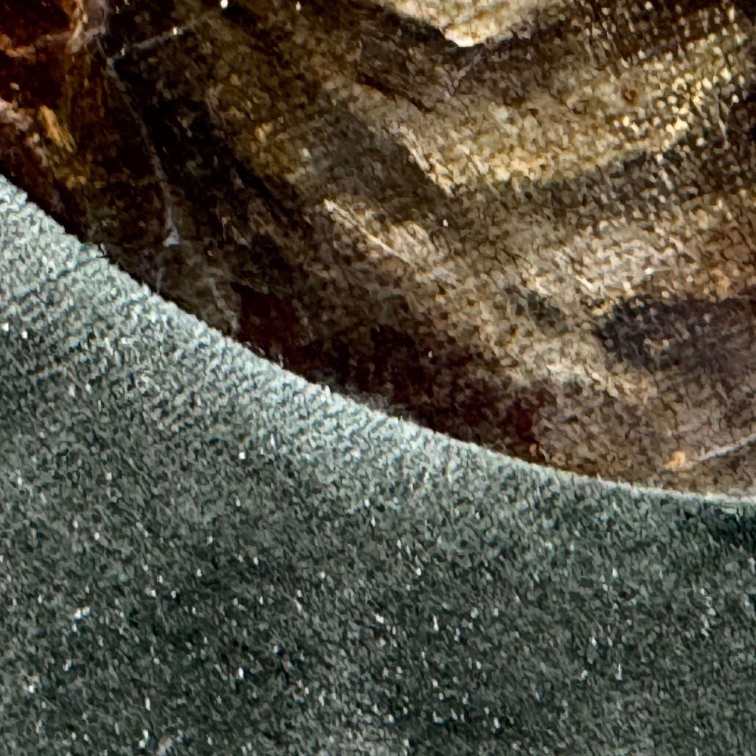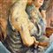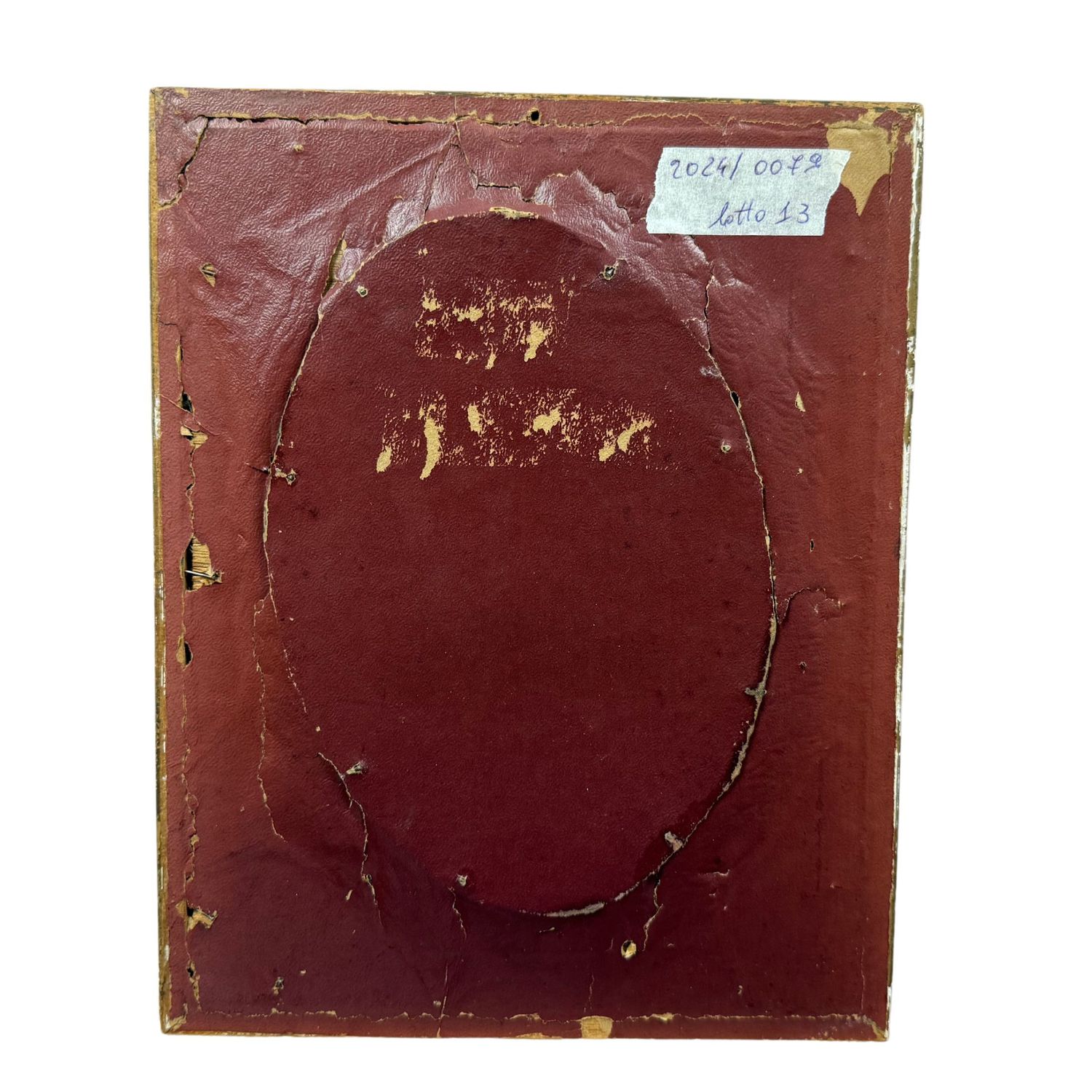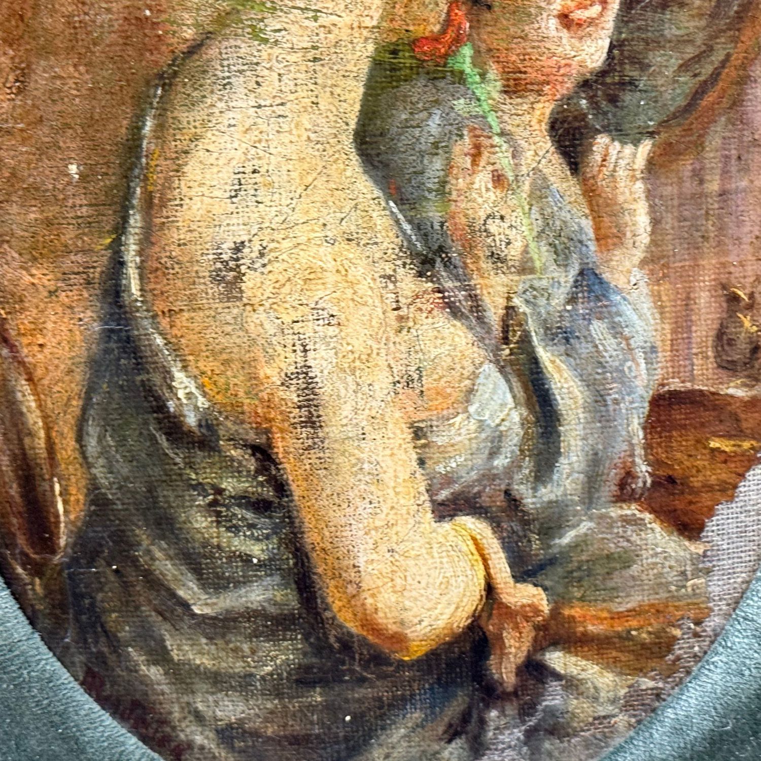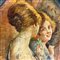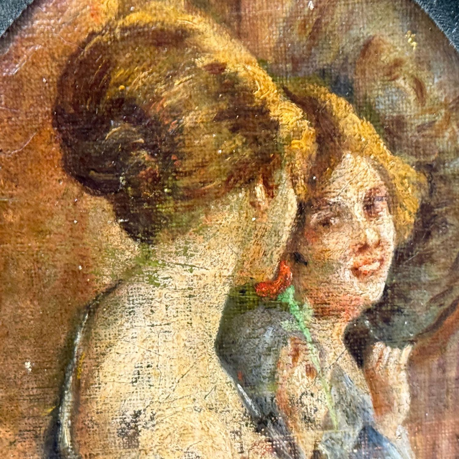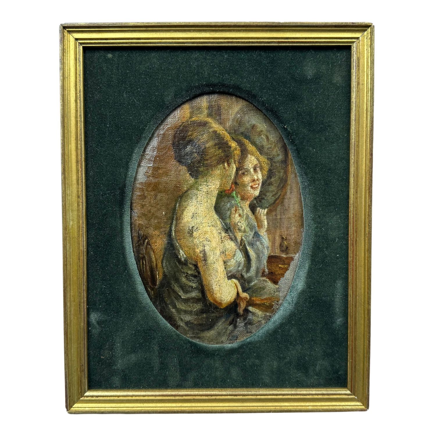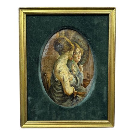 Dipinto di forma ovale olio su tela, periodo XIX/XX secolo scuola Italiana, raffigurante Donna allo specchio.