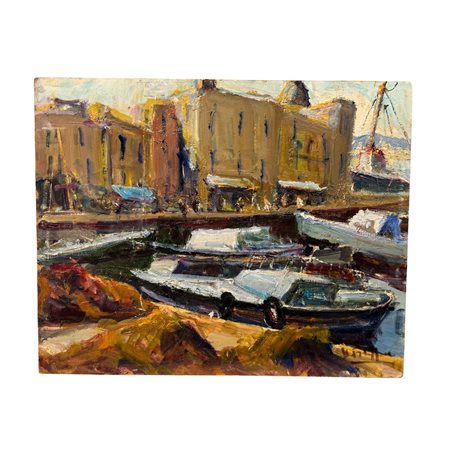 Dipinto olio su pannello, periodo XX secolo scuola Italiana, raffigurante Porto turistico.