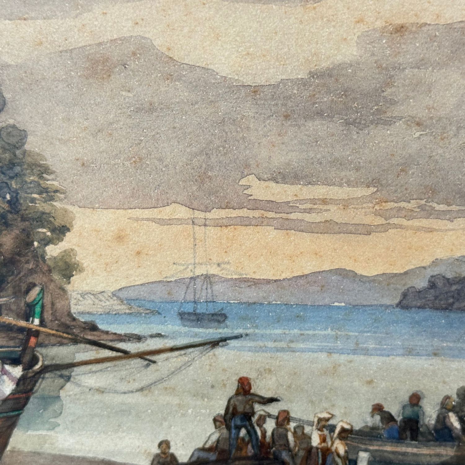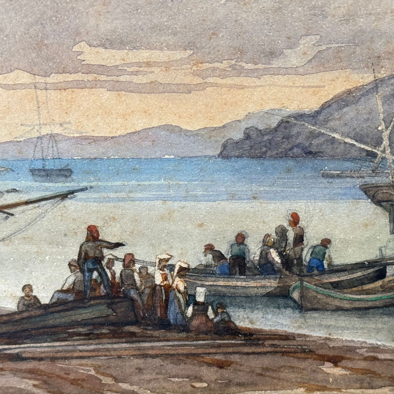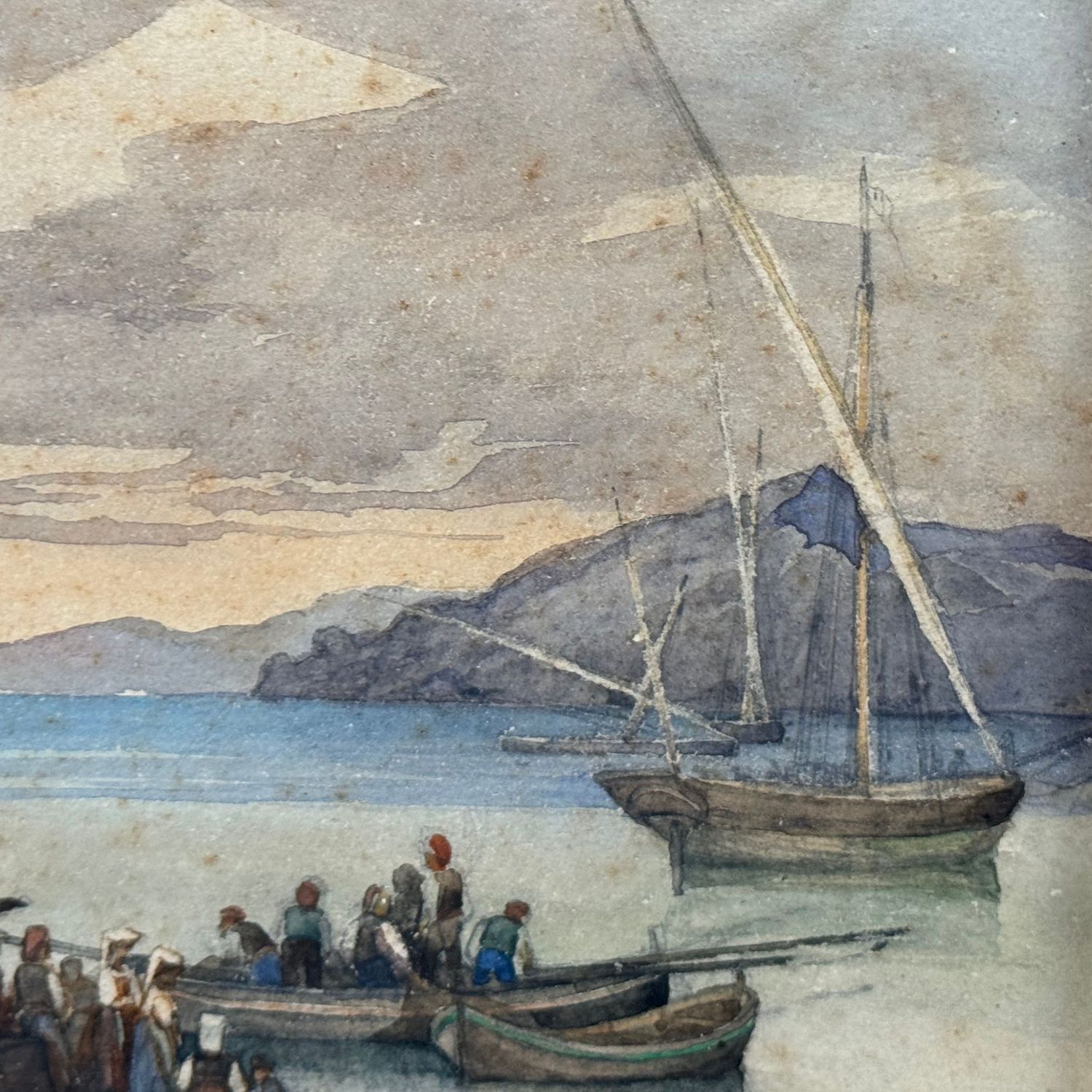 Dipinto tempera su carta, periodo XIX secolo scuola Italiana, raffigurante Pescatori a Napoli.