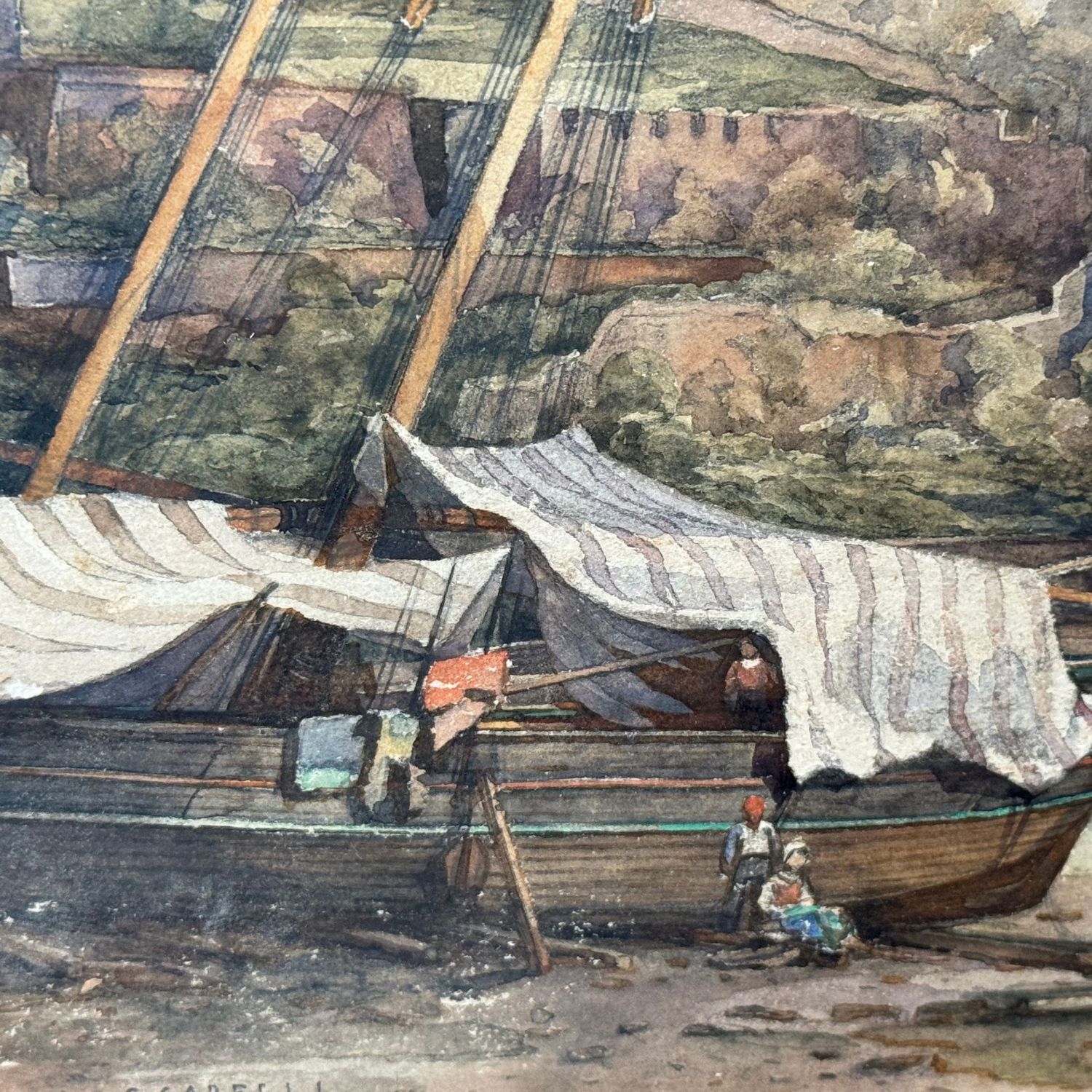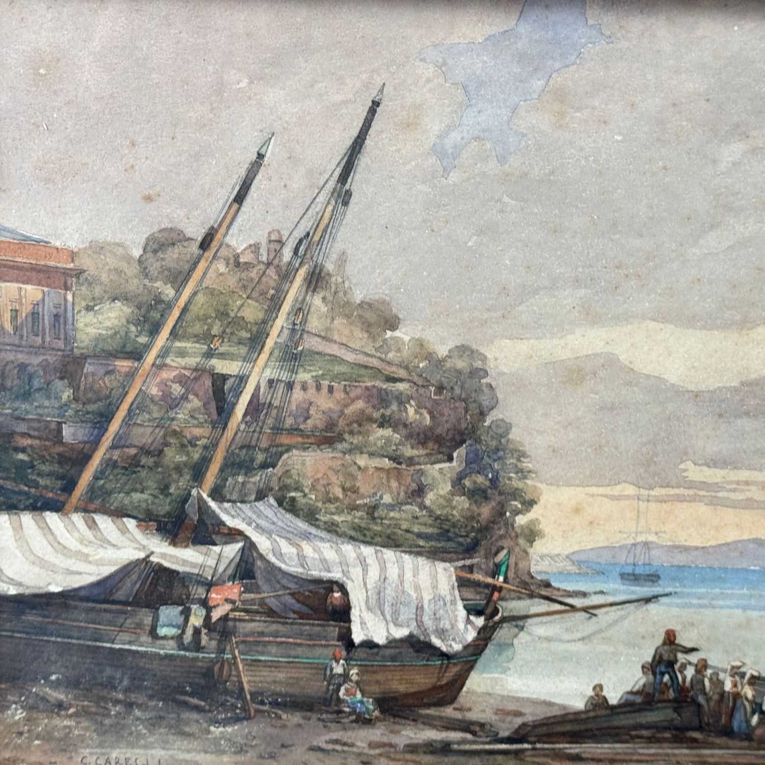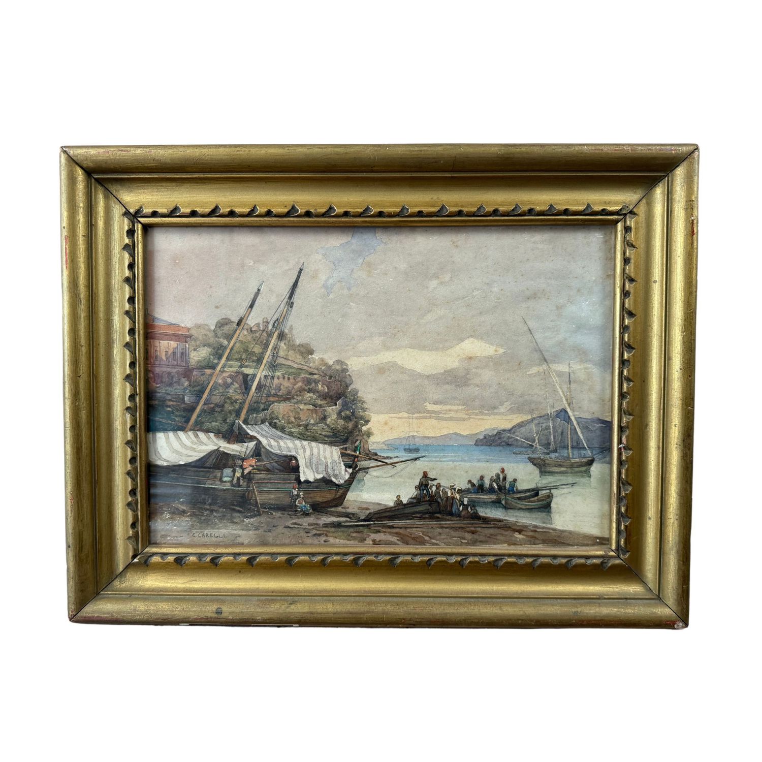 Dipinto tempera su carta, periodo XIX secolo scuola Italiana, raffigurante Pescatori a Napoli.