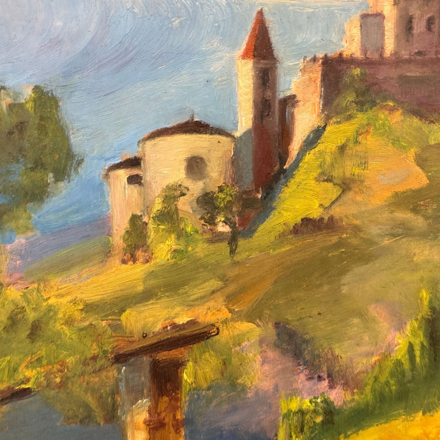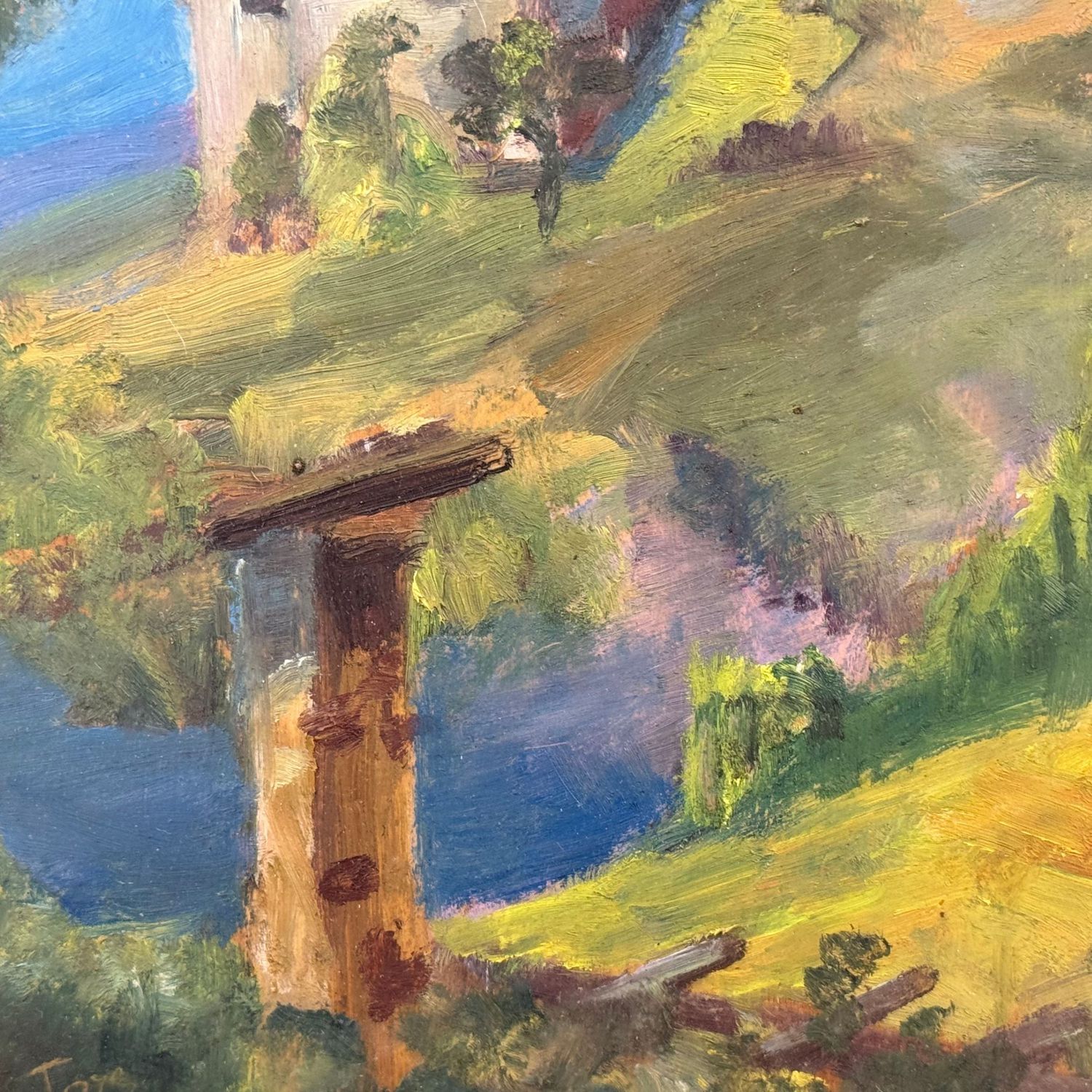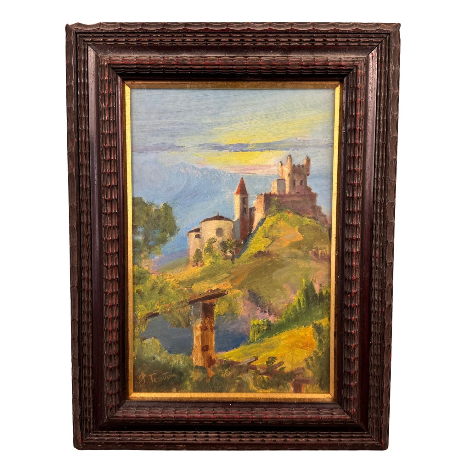 Dipinto olio su tavola, periodo XIX/XX secolo scuola Italiana, raffigurante Paesaggio con campanile.