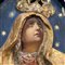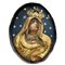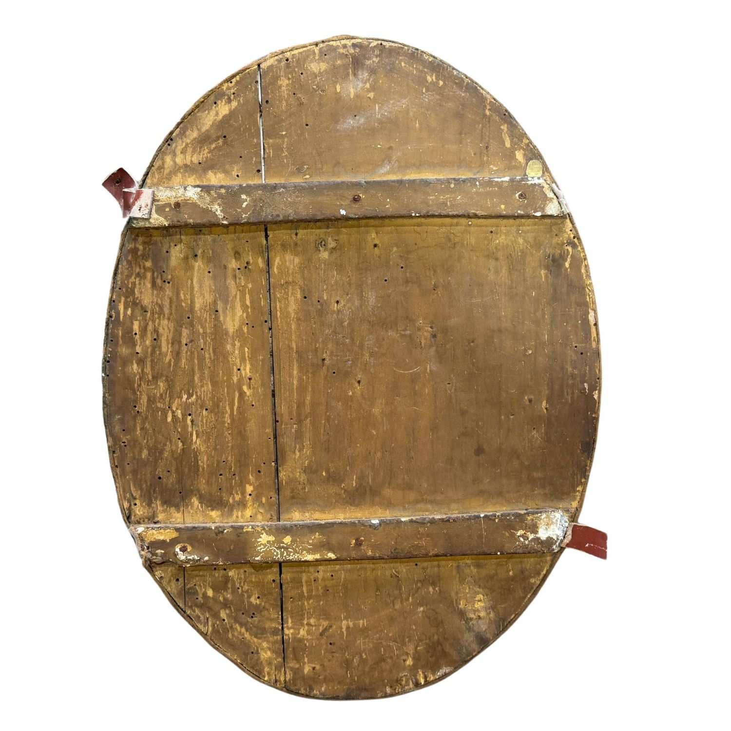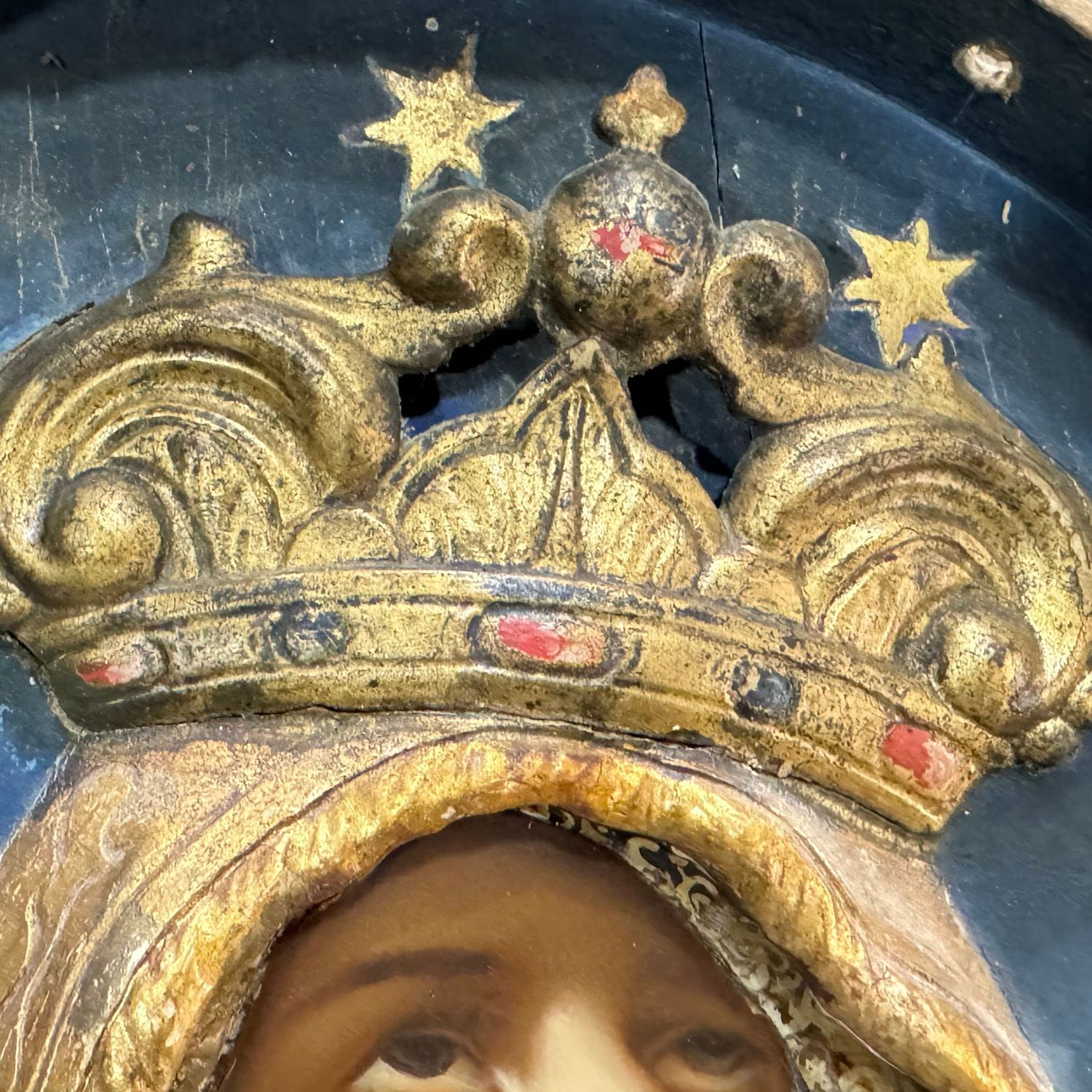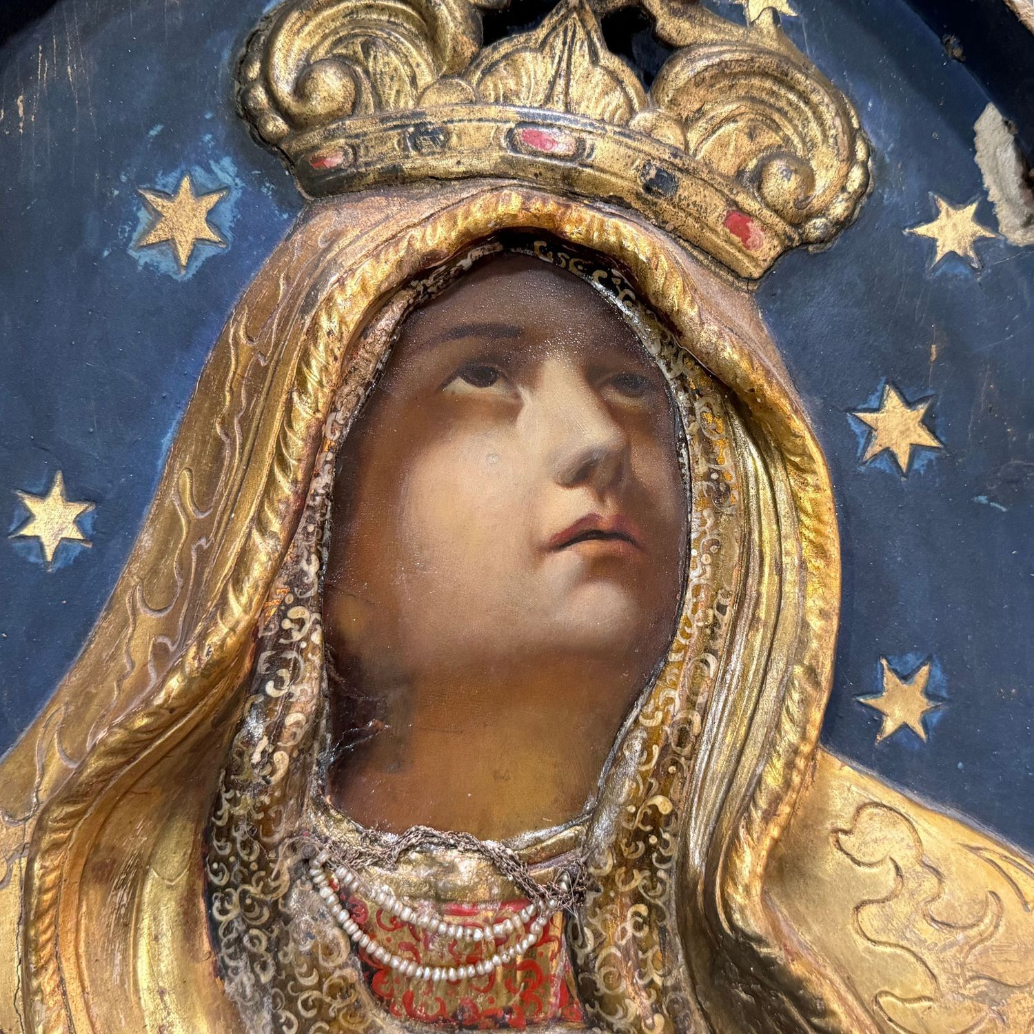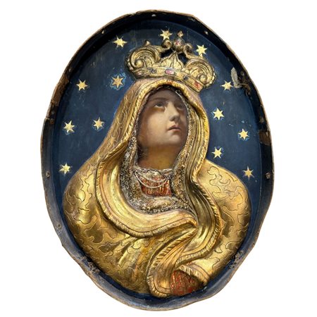 Opera di forma ovale in cornice con all'interno una scultura in legno e stucco dorato con viso in carta dipinta e corona sul capo, raffigurante Madonna.