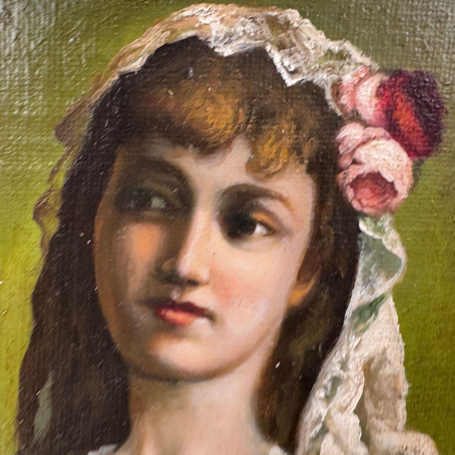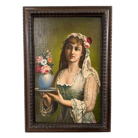 Dipinto olio su tela applicata su cartoncino, periodo XX secolo scuola Italiana, raffigurante Donna che regge una composizione di fiori