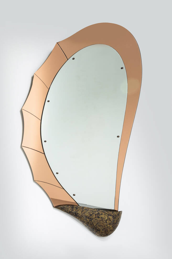 Struttura in vetro colorato e specchiato, particolari in ottone.