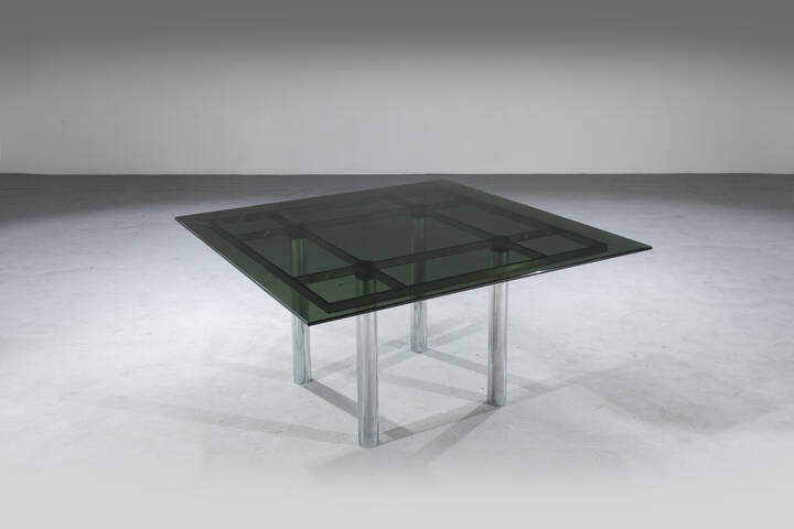 Struttura in acciaio cromato, piano in vetro fumè.