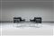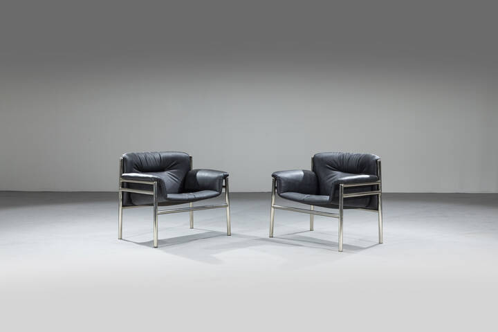 Struttura in acciaio, sedute e schienali imbottiti rivestiti in pelle.